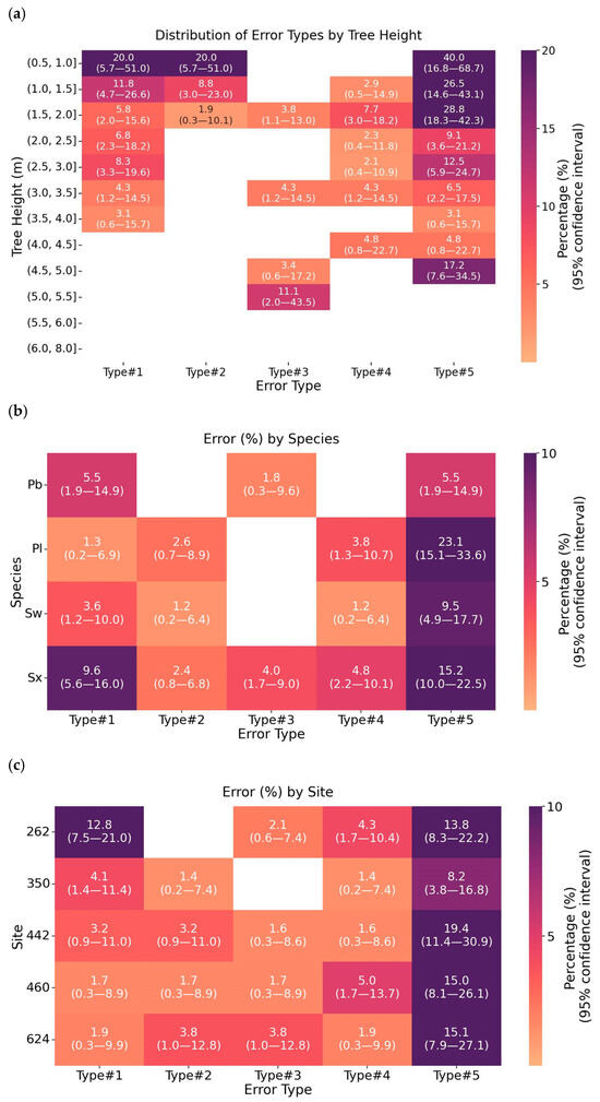 When separated by species (Figure 7b), all five error types appeared in willow. Error rates varied more by species than by the deciduous vs. coniferous grouping. For example, balsam poplar showed few instances of error type #2 to #4 compared to conifers (Figure 7b). Wider-crowned broadleaf species such as willow and poplar often have irregular or dome-shaped crowns, causing the detected apex to be offset from the true stem location, whereas narrow, conical crowns of species like lodgepole pine align more closely with the stem, resulting in smaller geolocation errors. All five error types occurred across the different sites, with less site-specific variation than seen among species (Figure 7c).