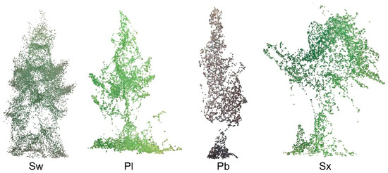 Representative individual-tree RGB point clouds for four species: white spruce (Sw), lodgepole pine (Pl), balsam poplar (Pb), and willow (Sx).