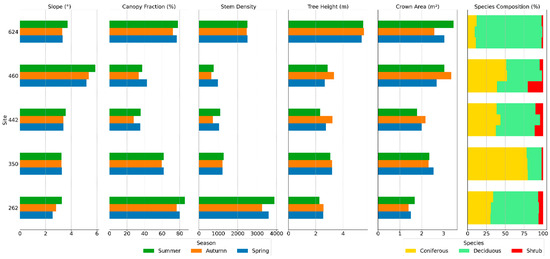 Slope (°), canopy fraction (%), stem density (sph), tree height (m), crown area (m2) and species composition (%) across five sites and three seasons: summer (green), autumn (orange), and spring (blue). Species compositions include coniferous (yellow), deciduous (green), and shrub (red).