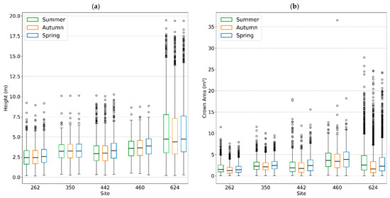 Box-plot illustrating the data distribution of individual-tree height (a), and crown area (b) across three seasons by site. The central line represents the median; box edges show the 25th and 75th quartiles. Whiskers extend to values within 1.5 times the interquartile range and points beyond the whiskers indicate outliers.