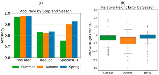 Seasonal variation in model performance: (a) accuracy of the three DL modules (TreeFilter, TreeLoc, and SpeciesCls) across seasons; (b) relative height error compared to ground-surveyed tree heights. The central line represents the median; box edges show the 25th and 75th quartiles. Whiskers extend to values within 1.5 times the interquartile range and points beyond the whiskers indicate outliers.