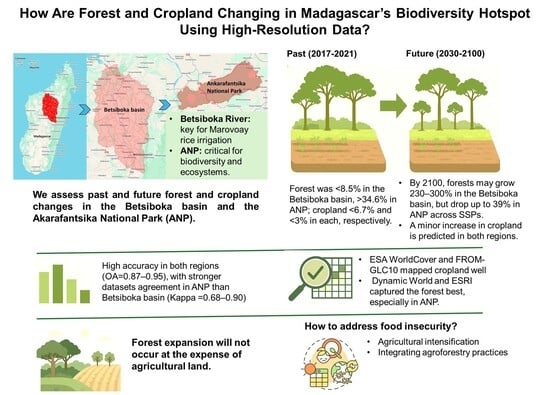 - FROM-GLC10 and ESA best for cropland in Betsiboka; DW and ESRI best for forest, especially in ANP. By 2100, forests may rise 230–300% in Betsiboka but drop up to 39% in ANP across SSPs.
