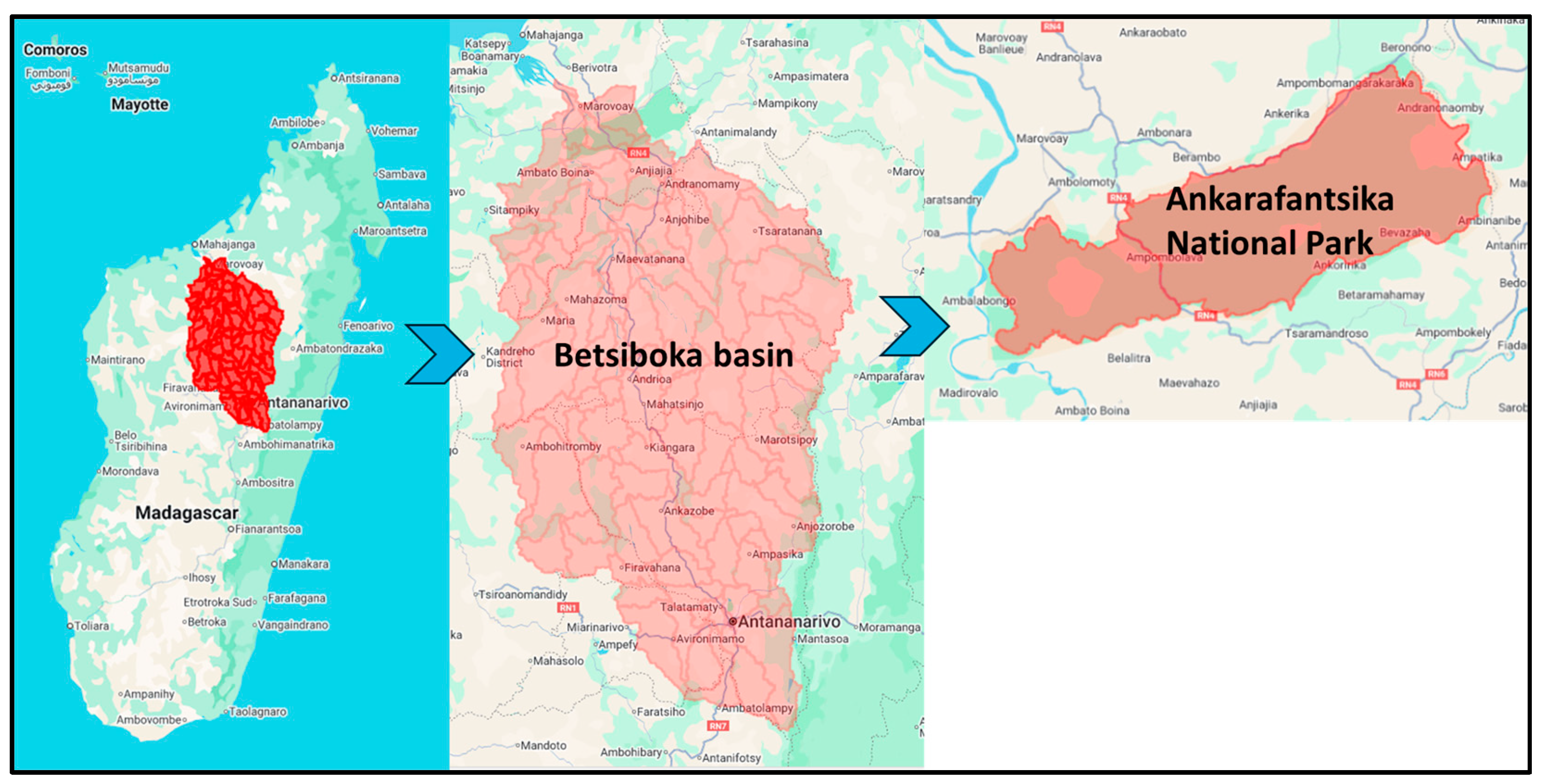 - Rakotoarimanana, Z.H.; Ishidaira, H.; Magome, J.; Souma, K. Unveiling hydrological responses in Madagascar’s major river basins: Addressing data scarcity and land-use change impacts. Hydrol. Sci. J. 2025, 70, 559–580. [Google Scholar] [CrossRef]
