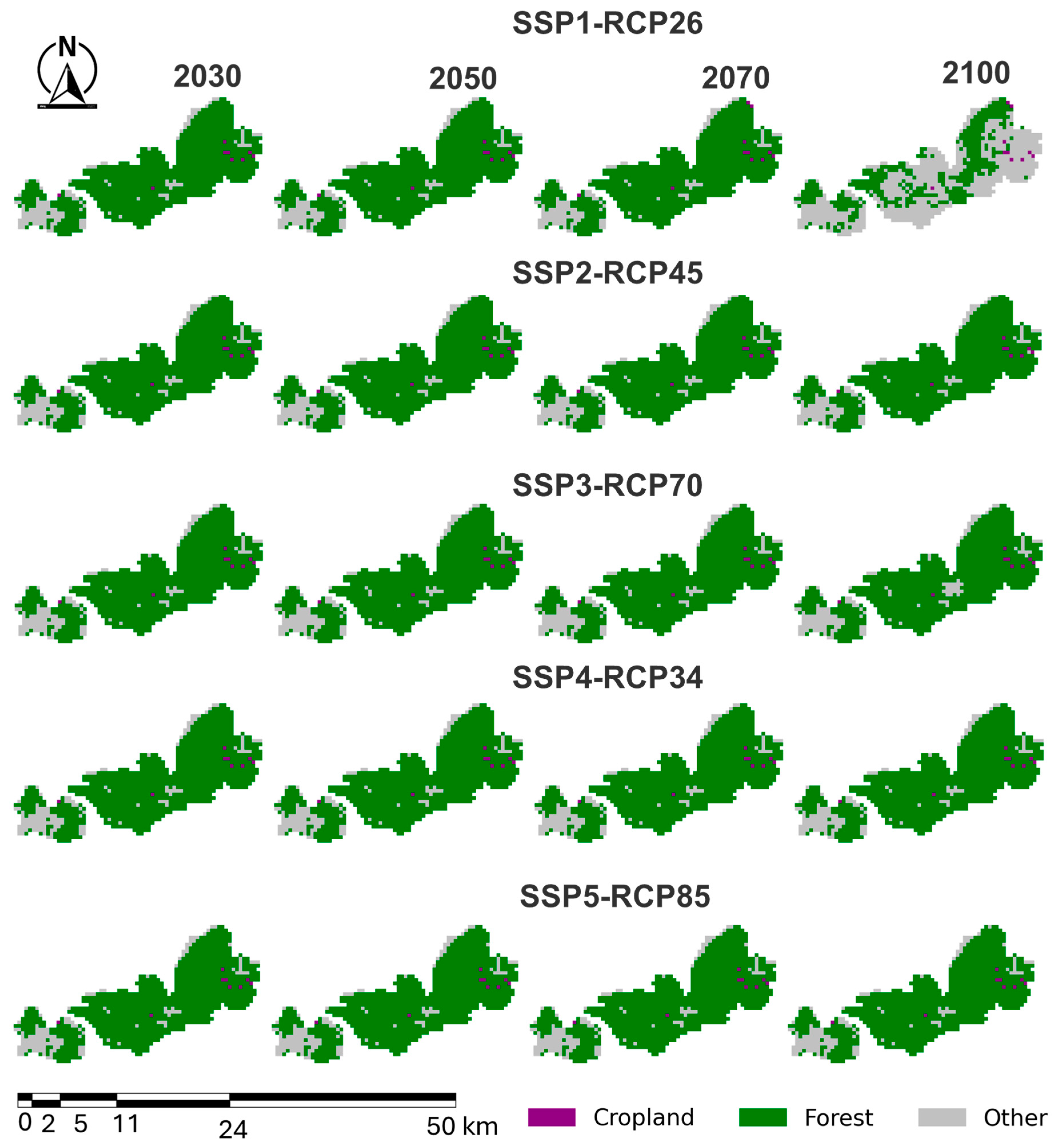 - Cropland remained broadly stable, though scenario-specific expansions suggest that forest expansion will not occur at the expense of agricultural land. The aggregation of land cover into Forest, Cropland, and Other, while analytically convenient, is a limitation as it may obscure finer-scale dynamics and transitions relevant to landscape change. To address food insecurity, agricultural intensification is suggested to increase food production on existing croplands. This can be complemented by integrating agroforestry practices [41] to leverage forests as a source of diverse foods and income.