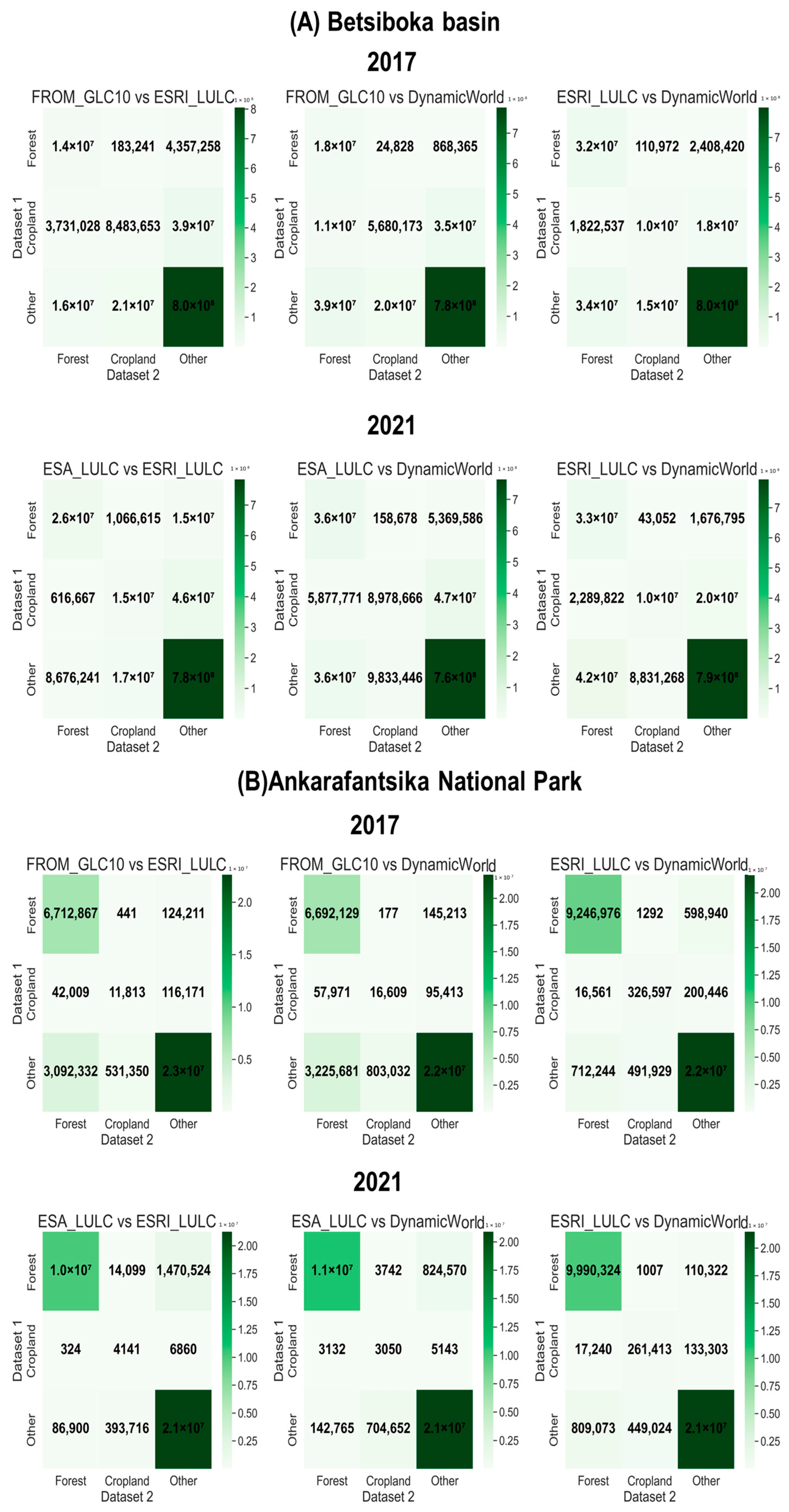 - In the Betsiboka basin, FROM-GLC10 and ESA WorldCover provided more reliable cropland estimates, while Dynamic World and ESRI Land Cover were better for assessing forest areas. In the ANP, Dynamic World, and ESRI Land Cover offer more consistent estimates of forest and cropland cover. A limitation is the temporal mismatch among LULC datasets (2017–2023), though aligning them to the 2017–2021 period helped minimize bias. We recommend careful consideration of dataset characteristics when applying these products in Madagascar. Future work could incorporate ground truth data for validation and expand the comparison to additional datasets.