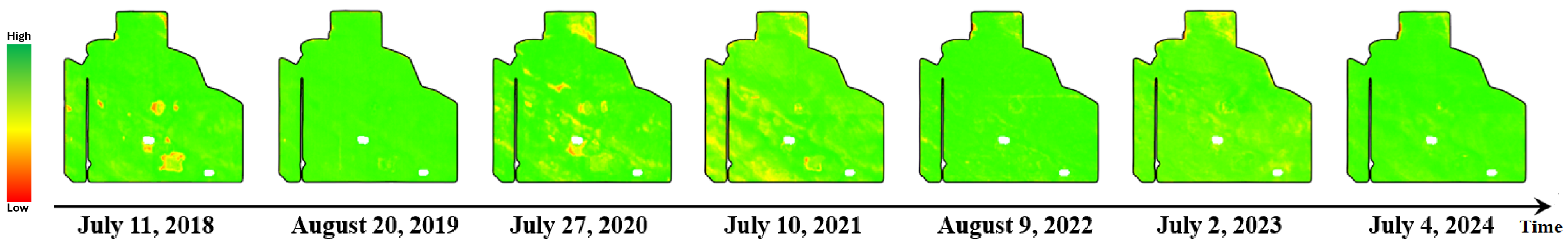 While baseline regions generally appeared to have higher performance and lower variability, they are not uniformly flat. In many fields, baseline areas encompass sloped cropland that may be susceptible to soil erosion. Previous studies have shown that topographic features such as slope, curvature, and elevation strongly influence soil erosion, soil moisture distribution, nutrient cycling, and microclimatic conditions, thereby affecting crop growth and yield [19,30,31]. Moreover, terrain-derived indices such as the STI and TWI provide complementary information on detachment, transport, deposition, and hydrologic pathways, and are widely used to identify erosion-prone positions in agricultural lands [5,7]. However, relationships between terrain metrics and crop yield are highly site- and climate-dependent—for instance, upslope length and curvature correlate more strongly with wheat yield in dry years than in wet years [18]. Collectively, these insights highlight both the promise and the limits of terrain features for guiding management decisions [4], underscoring the need for tools that allow local, case-specific examination of terrain–performance interactions.