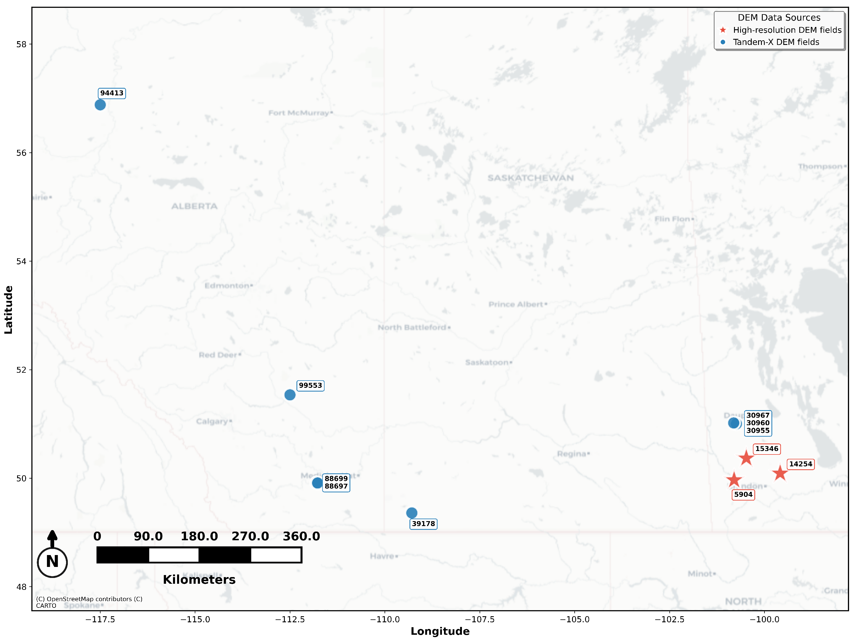 Data. Elevation data are sourced from the TanDEM-X Enhanced Digital Elevation Model (EDEM) (available at: https://download.geoservice.dlr.de/TDM30_EDEM; accessed on 3 February 2025), providing global 30 m spatial resolution with improved vertical accuracy for eight fields [25,26] (Table 1). For the remaining three fields located in Manitoba, higher-resolution airborne LiDAR-based HRDEM (available at: https://search.open.canada.ca/openmap/957782bf-847c-4644-a757-e383c0057995; accessed on 25 April 2025) is used, offering a 1 m DTM [12]. These high-resolution fields are denoted by stars in Figure 5, and their detailed specifications are provided in Table 2. Terrain features and landform classes are extracted from these DEM datasets, as detailed in Section 3.2.