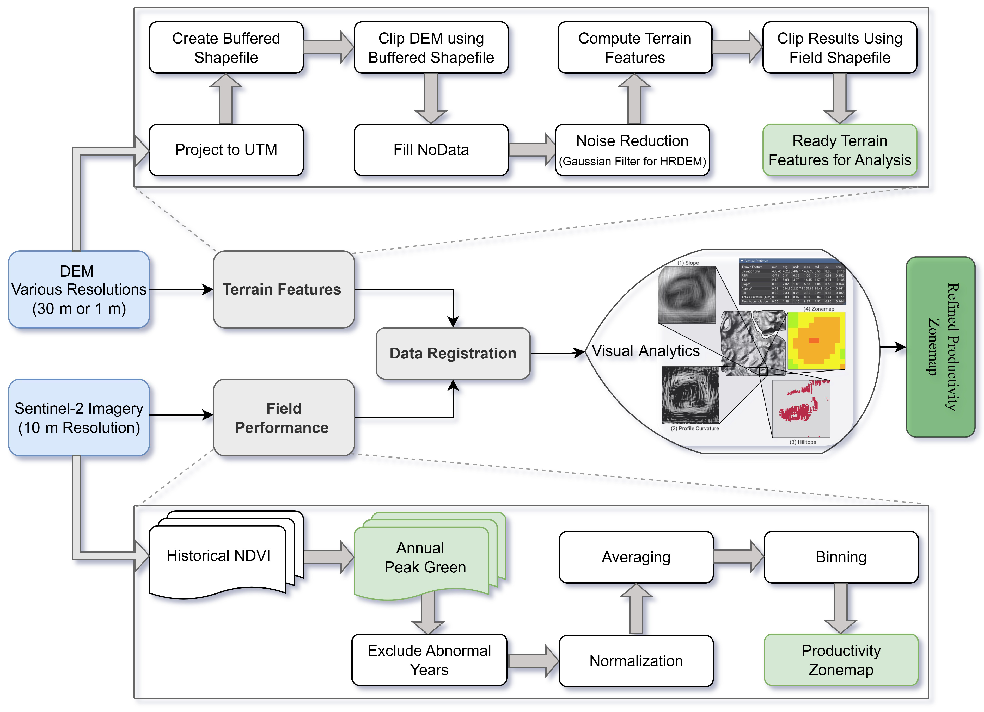 This paper investigates how topographic features influence performance and how this relationship can inform management decisions on the farm using remote sensing and terrain features. DEMs and VIs are integrated to visualize and evaluate terrain effects on field performance. The proposed system is useful in decision-making in the agricultural fields and refining MZs based on terrain features and landform classification. The methodology section comprises (Section 3.1) study area, data, and system overview; (Section 3.2) terrain features extraction and landform classification; (Section 3.3) field performance, zonemap, and their relationship with terrain features and landform classification; (Section 3.4) data registration; and (Section 3.5) visual analytics tool.