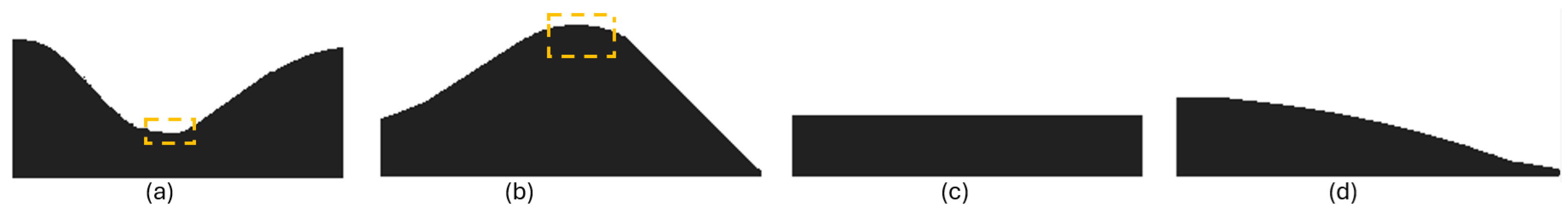 While terms such as hilltop, valley, and depression are commonly used across landform classification frameworks, their precise definitions may vary based on the computational method, scale of analysis, or application domain [55]. In geomorphological taxonomies such as Murphy’s system, terrain is categorized using a combination of structural, topographic, and process-based criteria, including classes like hills and low tablelands, plains, and depressions or basins [55,56]. In applied fields such as agriculture, simplified terrain classes are often adopted to interpret site-specific productivity patterns [45,49].