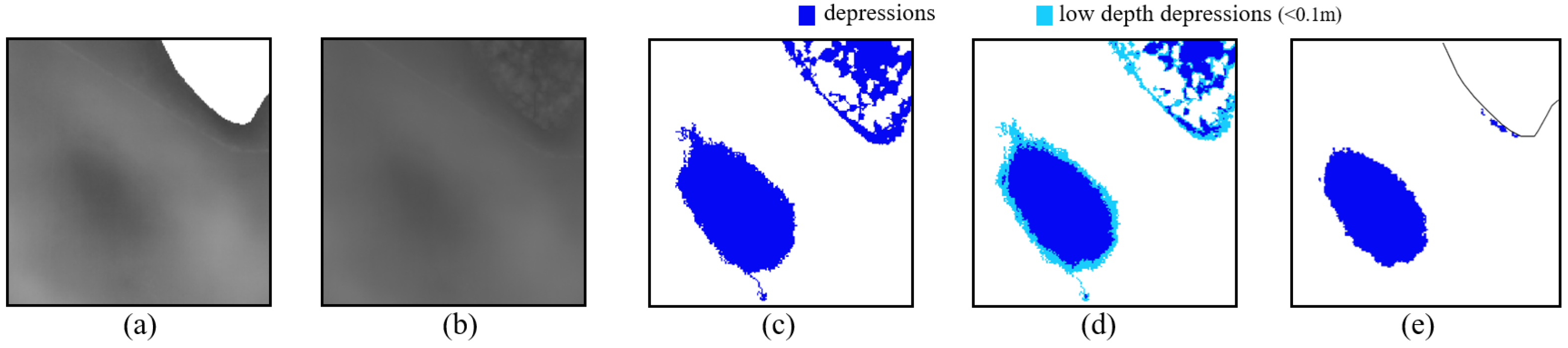 Depression delineation. Depressions are bowl-like areas where surrounding cells are higher in elevation (Figure 7a), and they can be natural or caused by noise and errors in DEM generation. There is no universally accepted method for accurately delineating the terrain’s real depressions [71], and methods try to balance the removal of artifacts with the preservation of actual topographic features. In this paper, depressions are identified using a multi-step approach applied to the preprocessed DEM (Figure 8). First, artificial pits are corrected using breaching and filling operations to ensure hydrologically sound surfaces. Then, depressions are identified and only significant depressed areas are retained by applying depth thresholds to eliminate minor artifacts [72]. The result is binarized to isolate depressions, and a neighborhood filter removes isolated pixels (<3 neighbors).