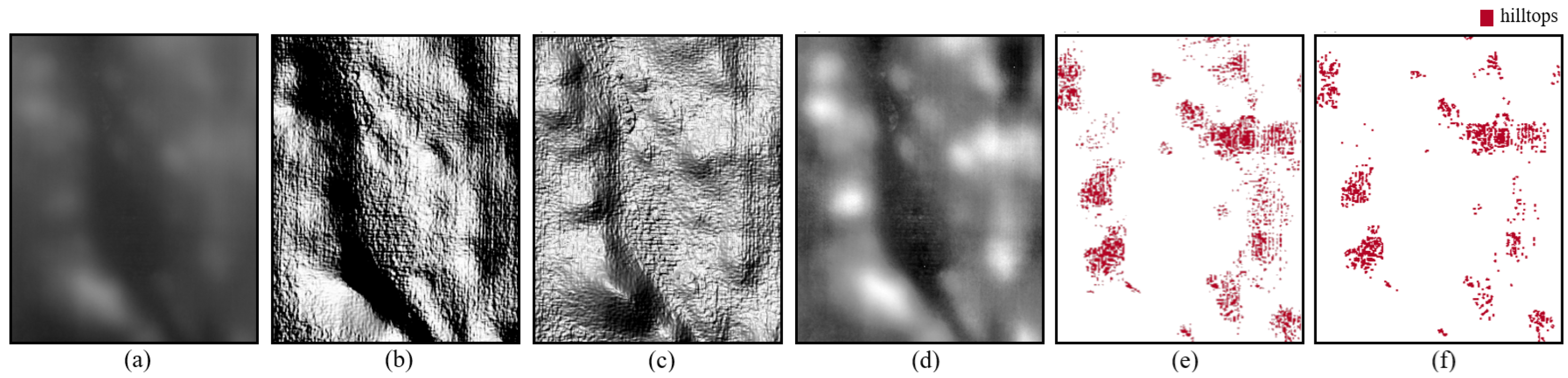 Hillshade is also computed to enhance terrain visualization, and it represents the intensity of reflected light from terrain surfaces, as influenced by slope orientation and the position of an artificial light source. While hillshade is used for visualization, it is fundamentally a mathematical derivative of terrain geometry and highlights subtle terrain features overlooked by simple peak detection. We use hillshade in hilltop identification to capture subtle topographic features that simple peak detection algorithms miss. To reduce directional bias, a multi-directional hillshading approach [13] is used, combining hillshades generated from eight azimuth angles with a moderate illumination altitude ( 25 ). This enhances the identification of subtle convexities typically found in low-relief agricultural fields.