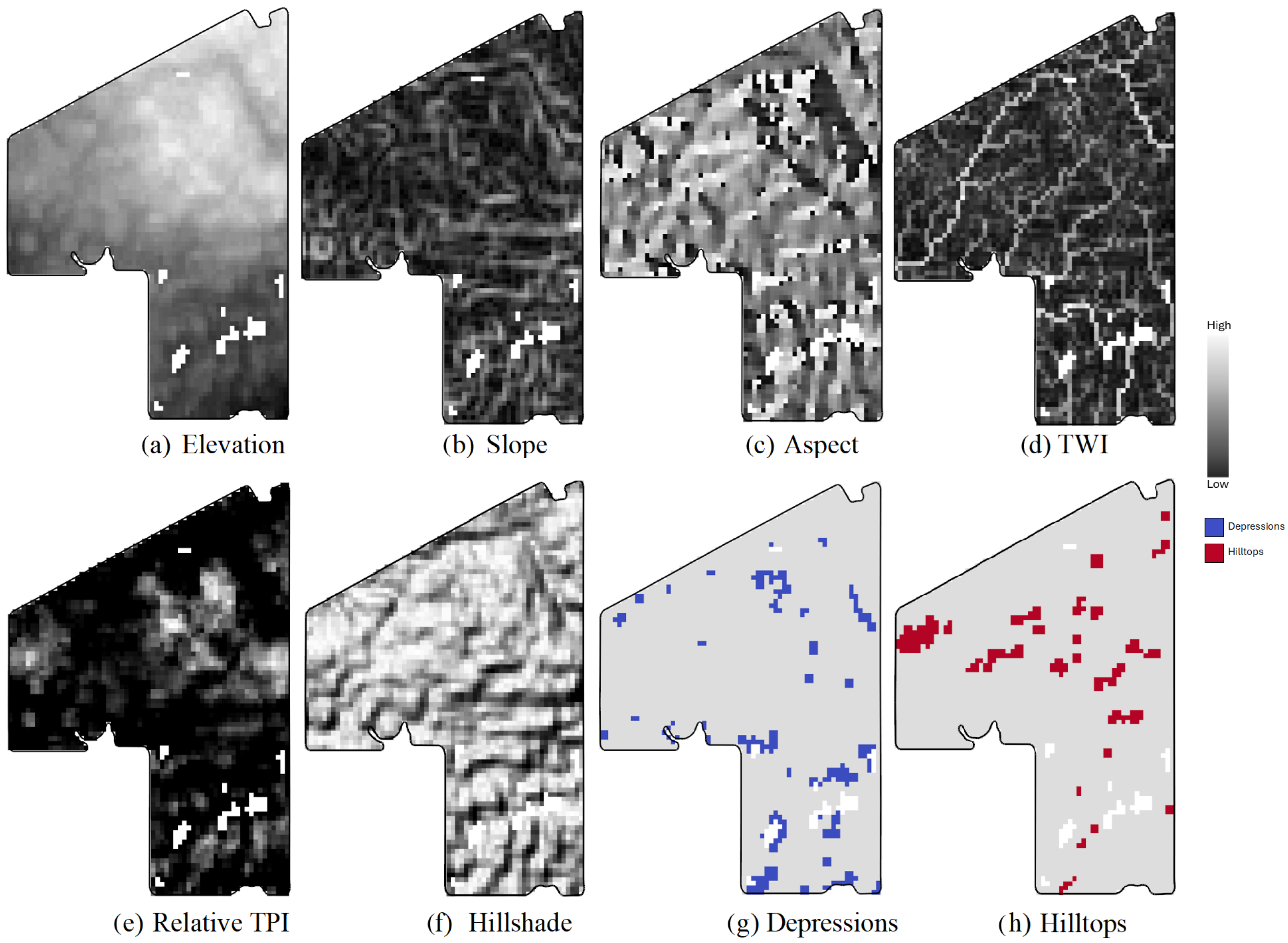 • Classifying agricultural land into depressions, hilltops, and baseline using terrain-derived indices, and quantifying and comparing performance across different classes.