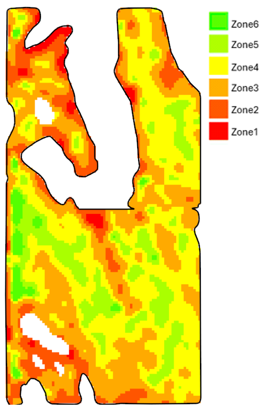 Several terrain features can be derived from DEMs, including slope, aspect, curvature measures, “Topographic Position Index (TPI)”, “Topographic Wetness Index (TWI)”, “Sediment Transport Index (STI)”, flow accumulation, and depressions, using tools such as Whitebox [13]. However, the large number of available terrain features [5] introduces the feature selection challenge, determining which features are most relevant to zone delineation. A common approach to address this challenge is dimensionality reduction, such as “Principal Component Analysis (PCA)” [14]. Alternatively, machine learning approaches implicitly learn complex patterns from all available features [15,16]. However, these data-driven techniques often lack interpretability [17] and are highly sensitive to context-specific factors, particularly at the field scale, where localized soil, management history, and topographic interactions can vary substantially [18,19].