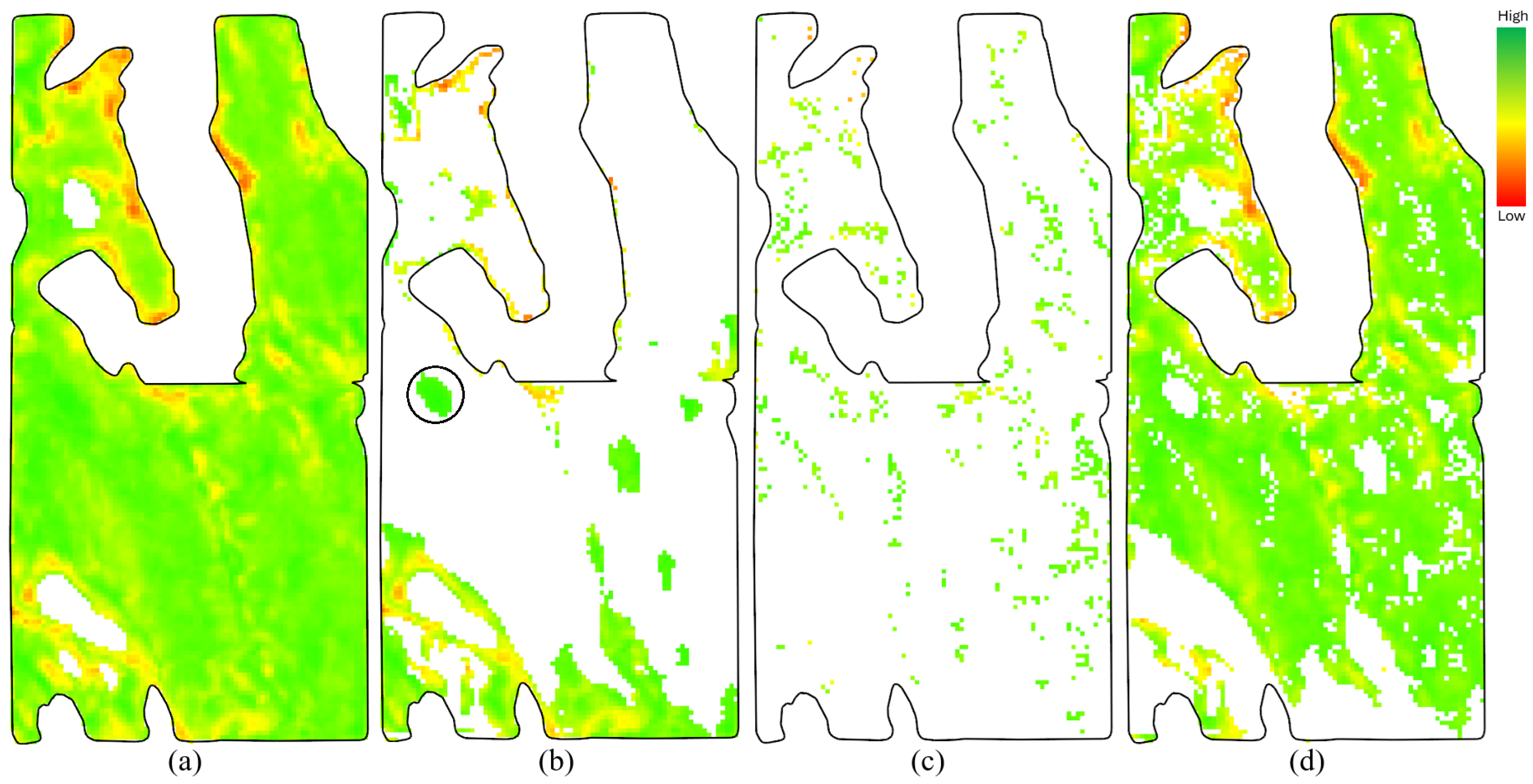 To isolate the effects of terrain on field performance from management practices, we focused on fields with consistent fertilizer application. We applied our visual analytics system to eleven agricultural fields across Canada, which were managed under constant-rate fertilizer regimes during selected years, including two irrigated sites. The system integrates three core datasets: peak green as a proxy for field performance; productivity zonemap; and elevation model (see Figure 2). Performance indicators were derived using the peak green approach [22,23,24], which extracts “Normalized Difference Vegetation Index (NDVI)” images corresponding to maximum vegetative growth (e.g., see Figure 3). MZs were delineated using our prior automated method [23,24]. Terrain features were computed from the TanDEM-X EDEM product [25,26,27,28] and from the higher-resolution HRDEM dataset, where available [12]. WhiteboxTools [13,29] were used to derive terrain features. The pipeline is explained in detail in Section 3.