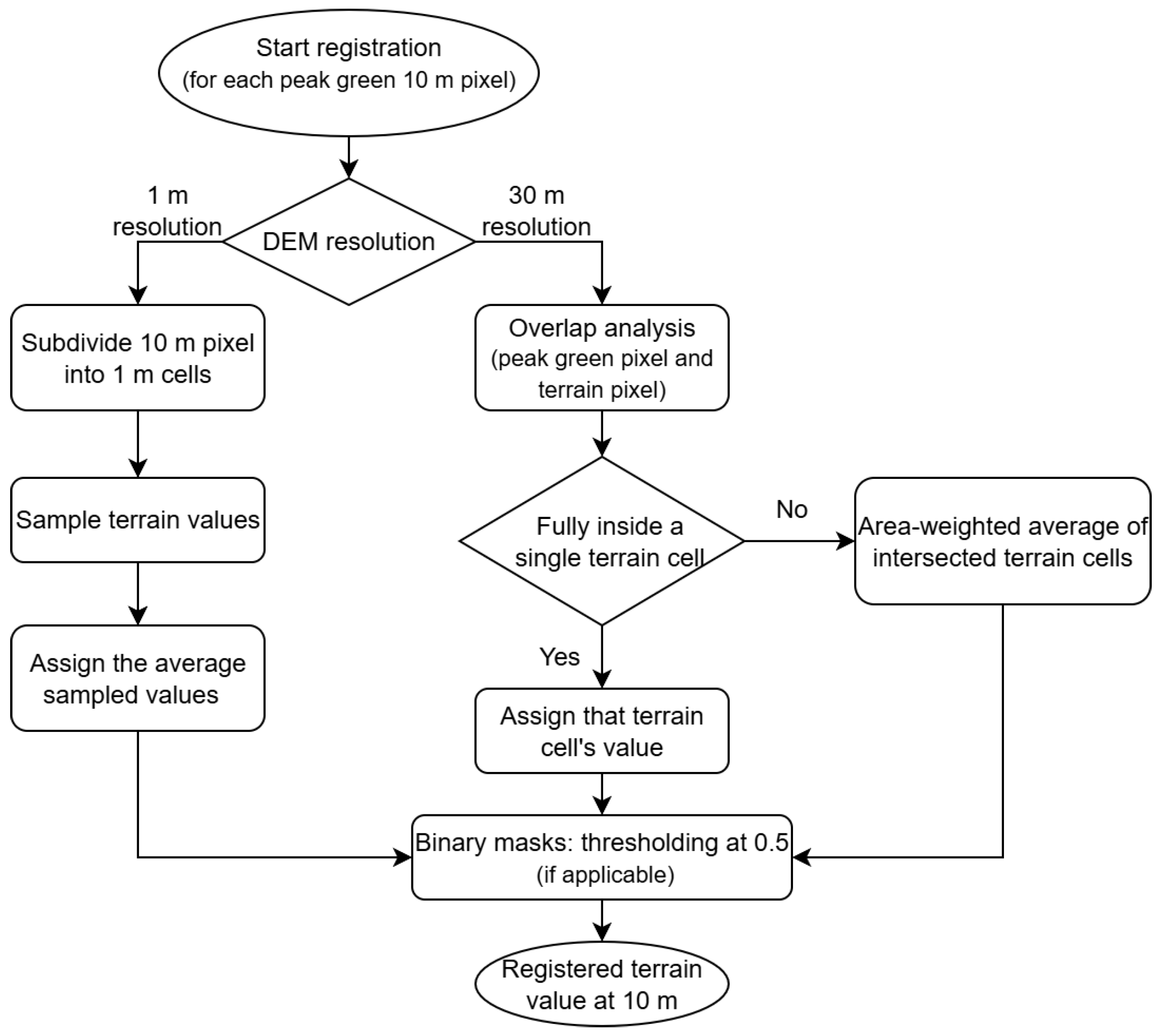 System Overview. The overall workflow is illustrated in Figure 6. After computing terrain features, peak green images, and productivity zonemap, the next step involves spatially integrating these datasets for terrain–performance analysis. This integration requires a precise data registration step, ensuring all datasets shared the same coordinate reference system and spatial extent despite differences in native resolution (e.g., Sentinel-2 at 10 m vs. DEMs at 1 m or 30 m). Specifically, the latitude–longitude coordinates of each performance pixel are used to retrieve the corresponding DEM-derived features, ensuring one-to-one correspondence between performance and terrain features (see Section 3.4).