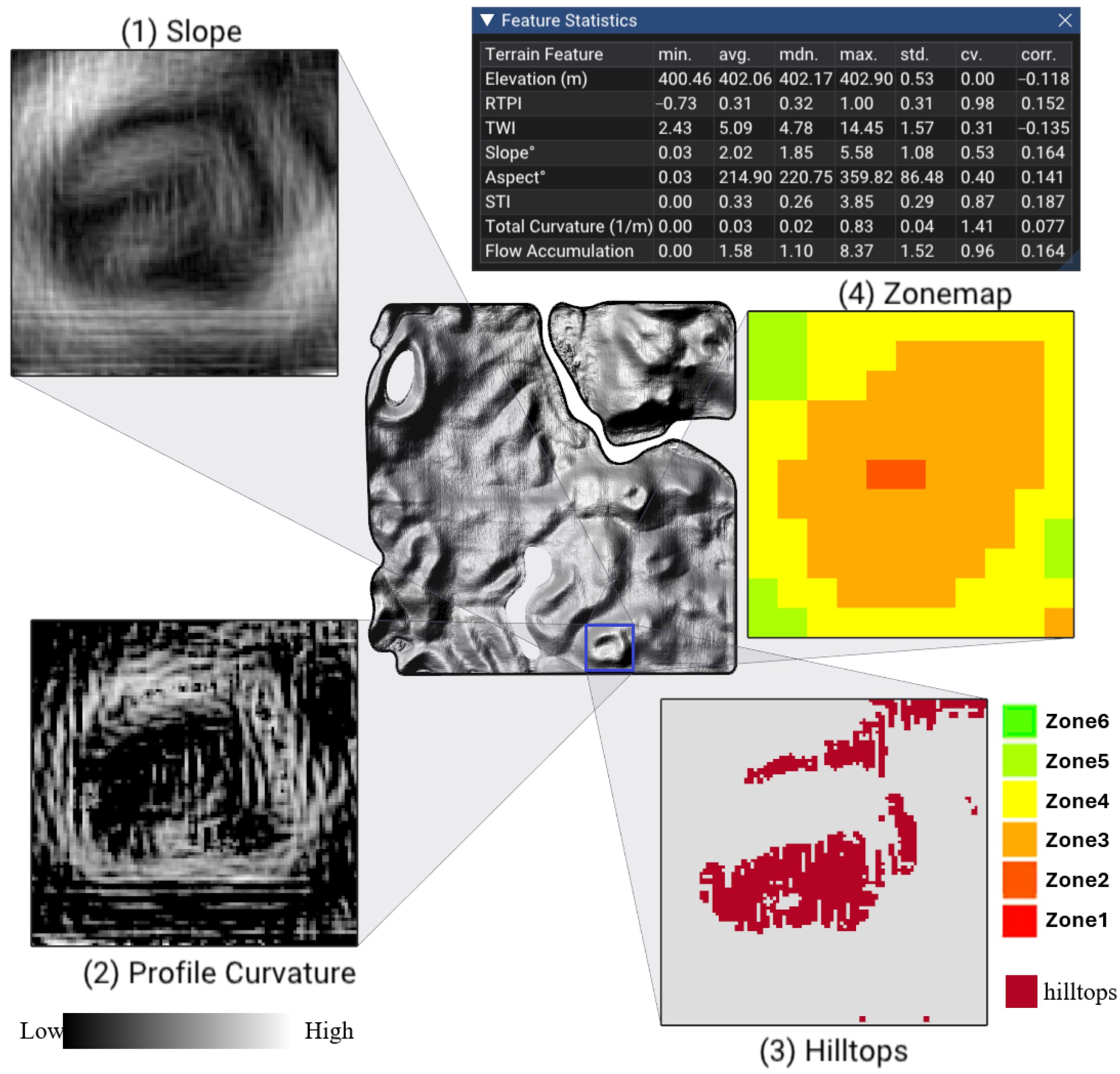 These studies highlight the value of terrain features in productivity MZ delineation but often rely on abstract indices rather than explicit landforms. In this paper, using our visualization tool, we demonstrate how landform classes, such as depressions and hilltops, can be utilized to identify low-performing regions to enhance interpretable decisions.