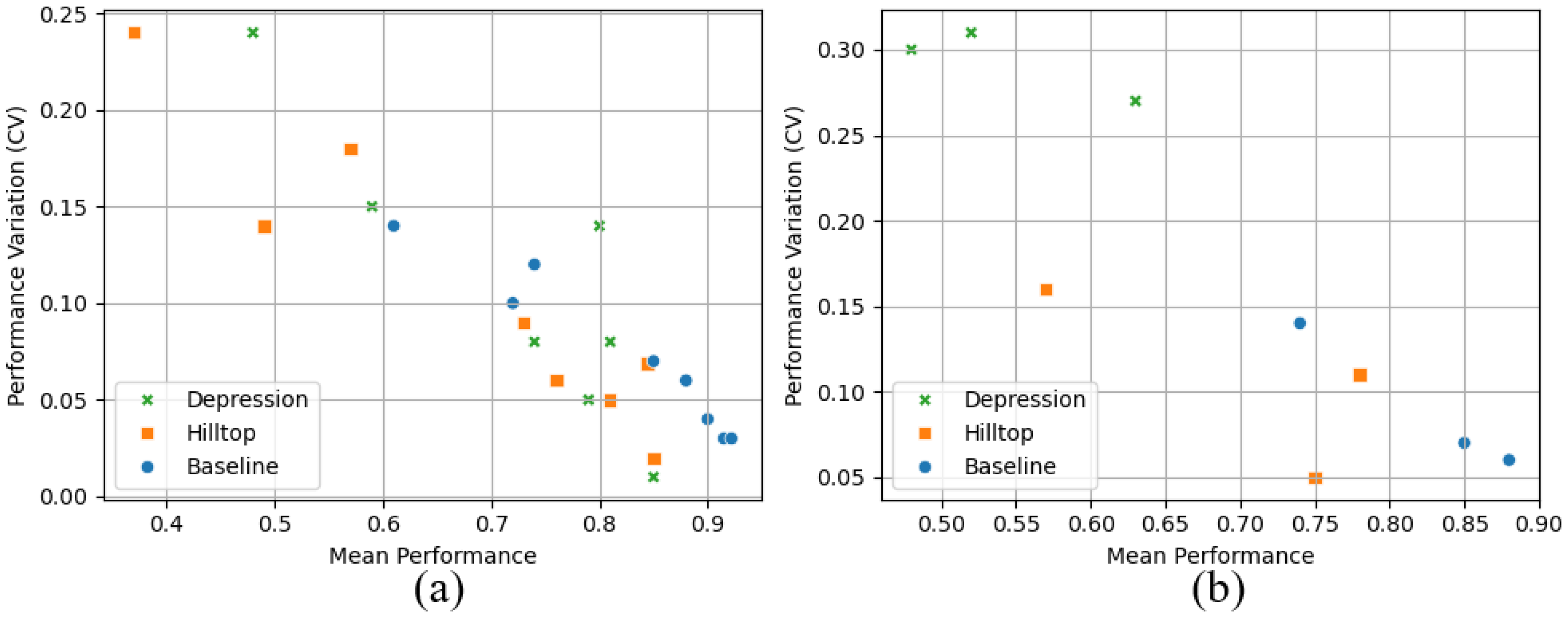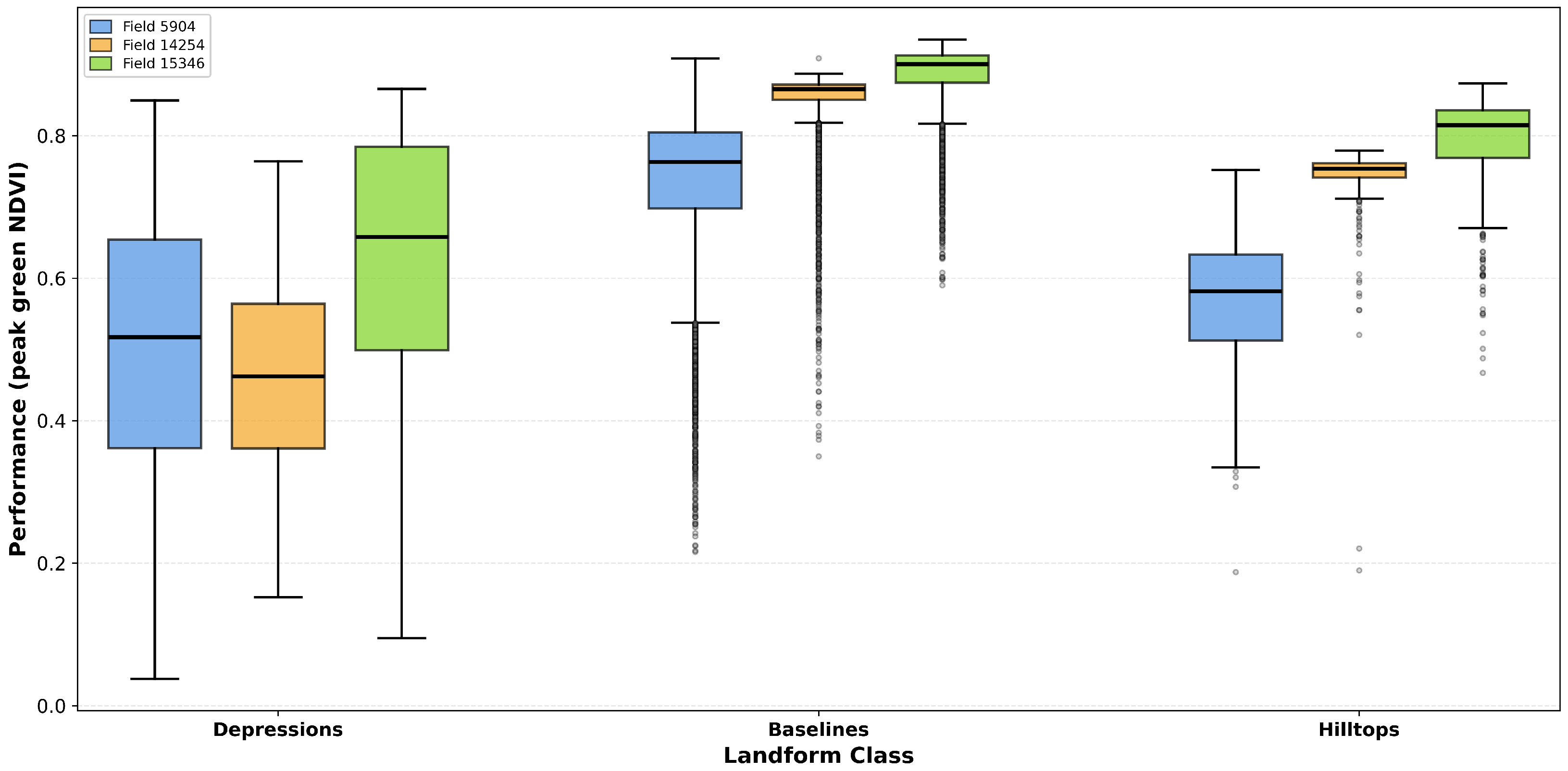Using our interactive visualization system with a human-in-the-loop approach, we observed that depressions and hilltops tend to host lower mean performance and higher variability, as measured by the “Coefficient of Variation (CV)”. The greater variability in performance values suggests that such regions are more sensitive to microtopographic and hydrological influences. Across all 11 experimental fields, depressed areas, though covering less than 10% of the field on average, consistently exhibited the lowest mean performance values. Hilltops ranked second lowest in terms of mean performance. In contrast, the remaining areas, hereinafter referred to as baseline, which comprise approximately 82% of the field’s area and do not fall within depressions or hilltops, demonstrated more stable and higher mean performance. These findings underscore the importance of incorporating terrain features and landform classes into spatial performance analysis and field management decisions. Our tool reveals localized patterns that are often obscured when using field-scale aggregate statistics (See Figure 4).