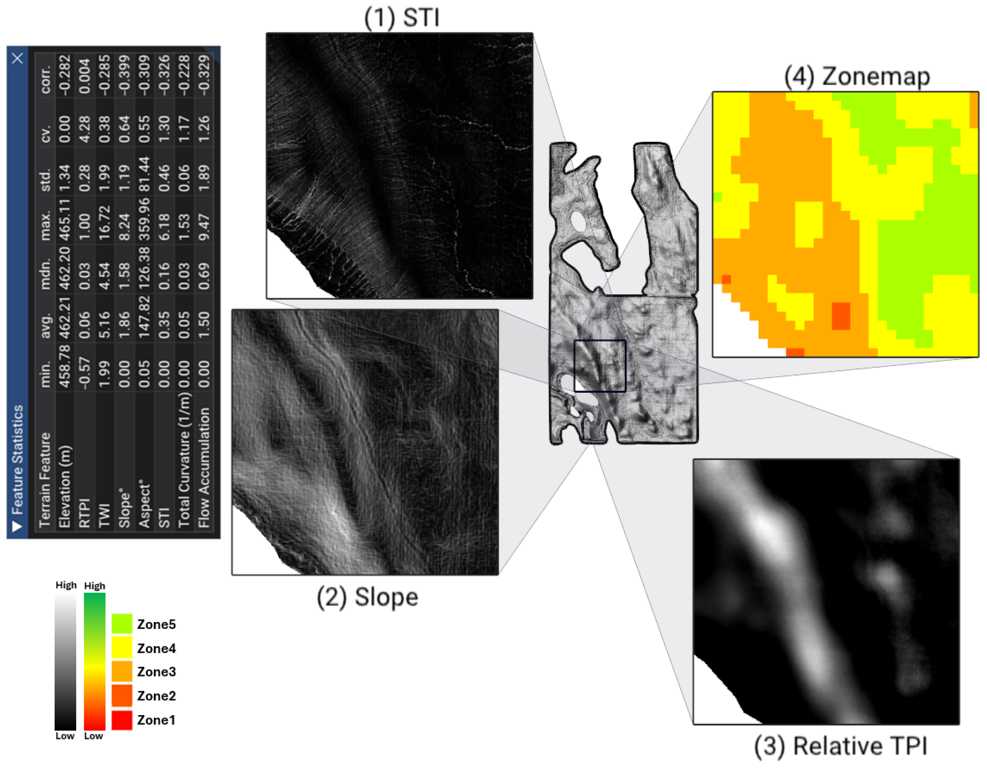 The delineation of “Management Zones (MZs)” is a key component of precision agriculture, aiming to divide fields into subregions that can be managed based on localized biophysical and agronomic conditions [1]. Most delineation approaches rely on soil potential and productivity metrics such as crop yield or “Vegetation Indices (VIs)” [2]. However, productivity potential is influenced by a complex interplay of factors, including weather variability, precipitation, farm management practices, soil properties, and topographic features. Some of these factors, such as fertilizer deficiencies, are manageable, whereas others, like extreme weather events, are beyond the control of agronomists. Moreover, certain factors directly influence crop growth (e.g., water availability), while others act indirectly (e.g., terrain features affecting water retention) [3]. Isolating the individual contribution of each variable is methodologically challenging [4], as it requires controlling for other influences, which is an impractical condition in real-world field environments. As a result, while indicators like yield or VIs are frequently used for delineating MZs, they reflect aggregate outcomes and often obscure the underlying causes of spatial variability. Integrating terrain features into MZ delineation can help unravel this complexity for topographic features and support more topography-informed, site-specific management strategies [5]. For instance, two zones with similar historical yields may respond differently to inputs if one lies in a depression and the other on an elevated slope, owing to differences in water and nutrient redistribution patterns [6].