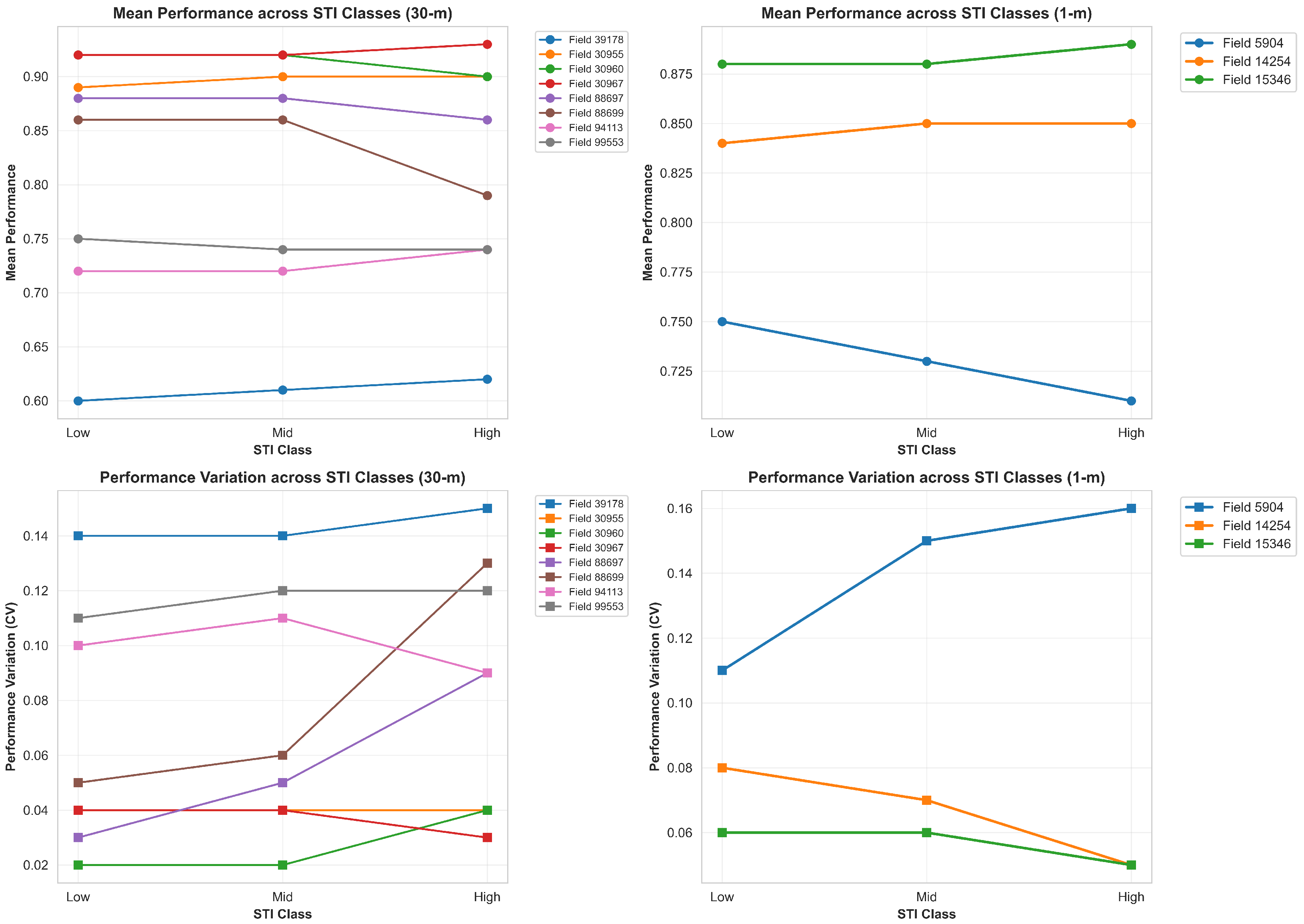 In light of these considerations, we further analyzed baseline areas to capture their internal variability. Hence, two complementary refinements were applied to baseline: slope-thresholding to distinguish relatively flat farmland from sloped cropland, and STI-based subdivision into three erosion-sensitivity classes. Results revealed only modest differences between slope- or STI-based subclasses, with STI subdivisions capturing some field-specific heterogeneity but showing no consistent performance gradients across all fields. These outcomes reflect the context-dependent nature of the erosion-related indices examined in this analysis (i.e., slope, STI).