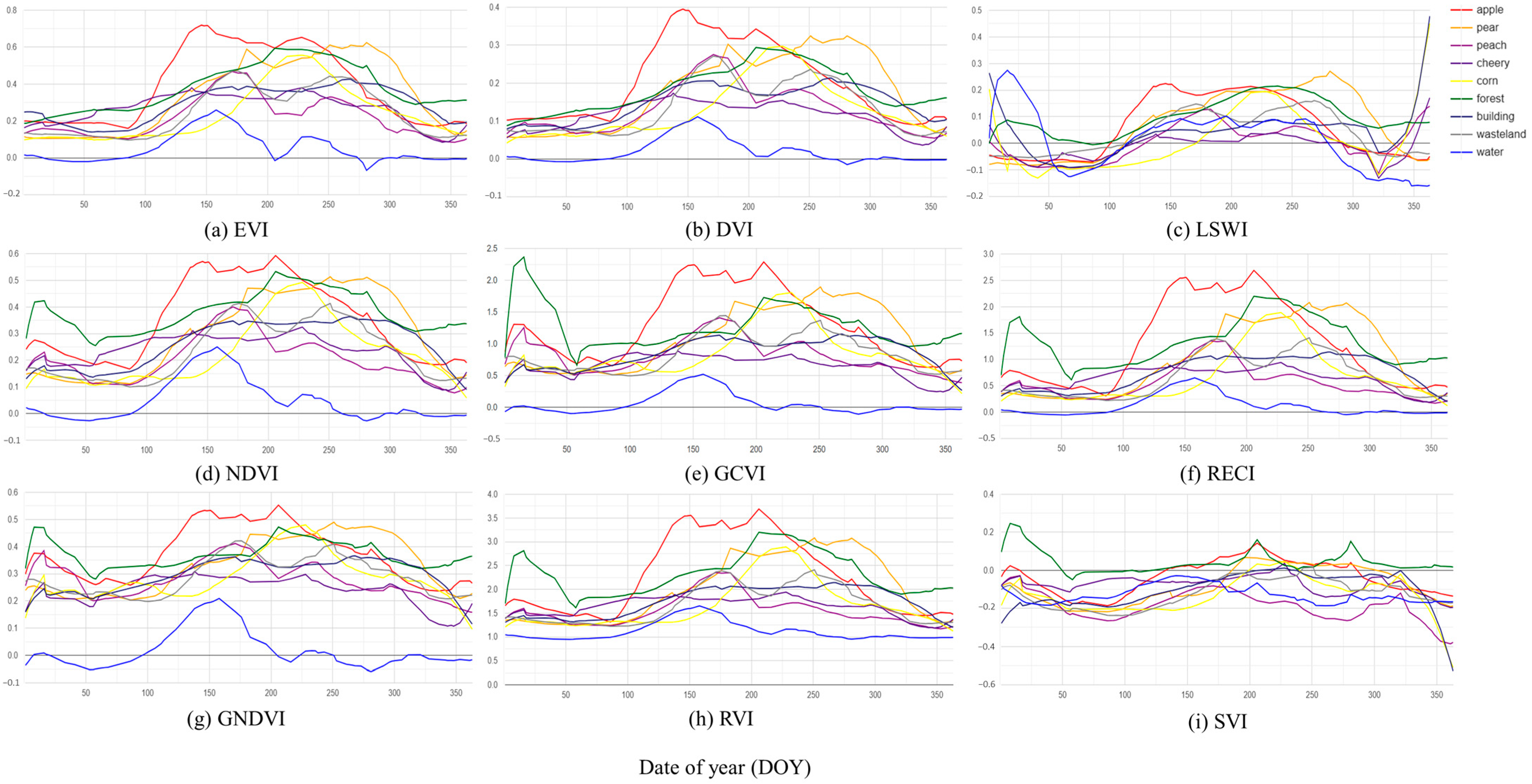 - Chen, H.; Li, H.; Liu, Z.; Zhang, C.; Zhang, S.; Atkinson, P.M. A novel Greenness and Water Content Composite Index (GWCCI) for soybean mapping from single remotely sensed multispectral images. Remote Sens. Environ. 2023, 295, 113679. [Google Scholar] [CrossRef]