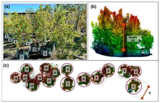 Region containing Lilly Pilly vegetation: (a) Close-up view showing Lilly Pilly vegetations with assigned identification numbers; (b) visualization of individual H measurements using 3D point cloud data; (c) visualization of D for each vegetation with assigned identification numbers.