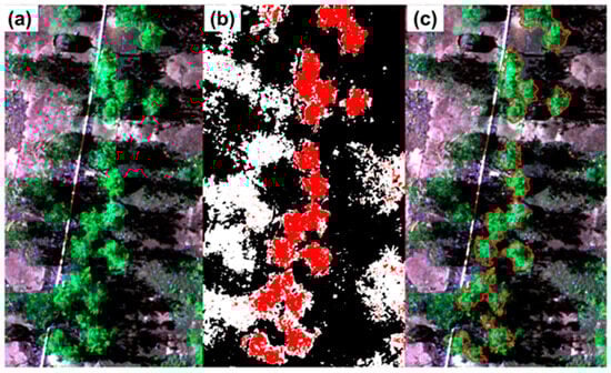 (a) MS orthomosaic map of the test region; (b) Semantic segmentation map produced by the meta-model where red pixels indicate the Lilly Pilly, white pixels indicate other vegetations, and black pixels indicate non-vegetation region; (c) Watershed-based delineation of Lilly Pilly patches visualized over the MS imagery, where red lines show the patch boundaries.