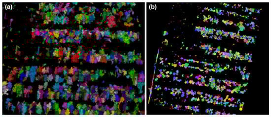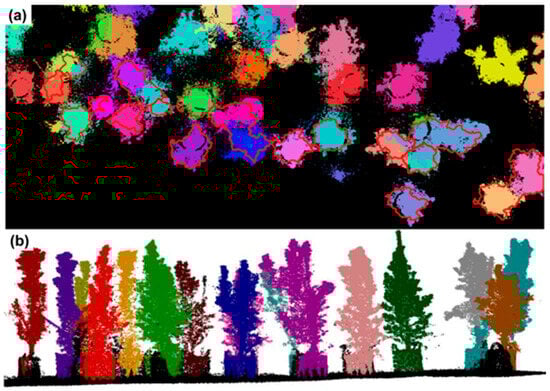 (a) Vegetation delineation derived from the LiDAR point cloud using RayCloudtools; (b) Projected Instance ID map visualizing individual vegetation segments, where different colors are assigned to different vegetation instances.