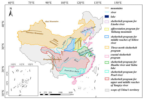 The study area covers the entirety of mainland China, spanning approximately 5500 km from north to south and 5200 km from east to west, with a total land area of about 9.6 million km2. Ecological systems across the country are highly diverse, including forests, grasslands, deserts, and wetlands. Climatic conditions range from humid subtropical zones in the southeast to arid and semi-arid regions in the northwest, accompanied by a wide variety of vegetation types such as temperate forests, alpine meadows, and desert shrublands [23]. The terrain is also complex, with plains dominating the east and highlands and mountains prevailing in the west. Mainland China has a permanent population of approximately 1.4 billion, with a highly uneven distribution—dense in the east and sparse in the west [24]. This study delineates shelterbelt program zones at the national scale and integrates regional variations in biophysical and socioeconomic conditions to assess afforestation potential and support ecological restoration and sustainable land use (Figure 1).