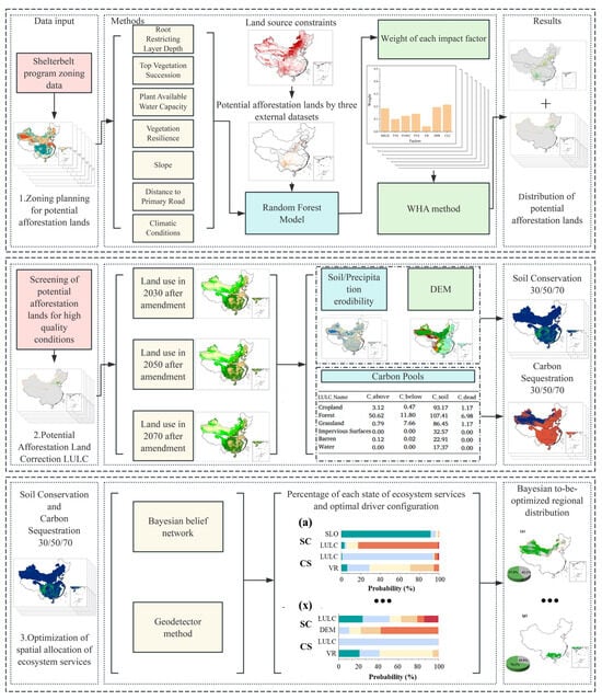 To address these gaps, this study focuses on China’s eight major shelterbelt regions and develops a spatially explicit assessment framework integrating multi-source data and multiple models. The framework identifies high-quality potential afforestation areas under future scenarios and evaluates long-term ecological impacts on soil conservation and carbon sequestration. It also optimizes the spatial allocation of ecosystem services across natural regions. Methodologically, the study combines Random Forest to build a potential afforestation index with a coupled Bayesian Network–Geographical Detector approach to determine optimal ecosystem configurations. The study aims to: (1) To incorporate spatiotemporal dynamics to assess the heterogeneous impacts of driving factors across China’s shelterbelt project regions, and produce a national-scale spatial distribution map of high-quality afforestation land. (2) To adjust land use data under potential afforestation scenarios and quantify ecological benefits using soil retention and carbon sequestration as key indicators; (3) To identify the optimal spatial allocation of the two ecosystem services between 2030 and 2070, and propose a zoning strategy of “optimized areas—areas to be optimized,” providing a scientific basis and technical support for future afforestation management and ecological policymaking.