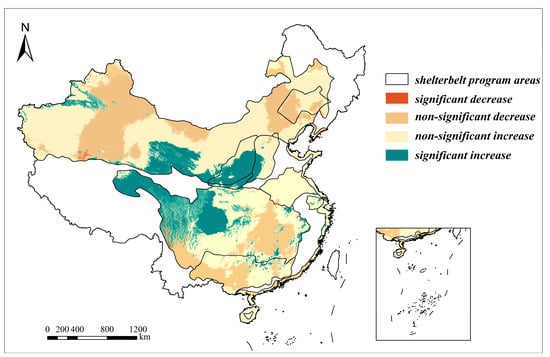This study employs the Miami model to assess the climate production potential of vegetation and applies the Mann–Kendall nonparametric statistical method to analyze the long-term trends in vegetation climate production potential across China from 1991 to 2020 (Figure 3). The Miami model determines the climate production potential by taking the minimum value between the temperature-based production potential and the precipitation-based production potential, providing a practical tool for evaluating the impact of climate on vegetation productivity [38]. The equations are as follows: