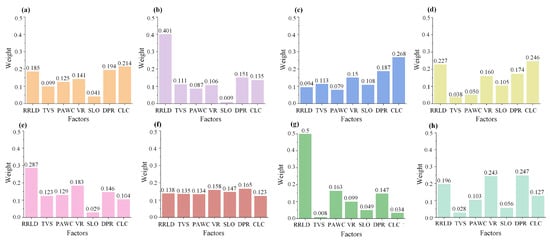 Weighted values of influencing factors for potential afforestation in shelterbelt program areas. (a) Three-north shelterbelt program; (b) shelterbelt program for Liaohe River; (c) shelterbelt program for middle reaches of Yellow river; (d) afforestation program for Taihang Mountain; (e) coastal shelterbelt program; (f) shelterbelt program for upper and middle reaches of Yangtze river; (g) shelterbelt program for Huaihe River and Taihu Lake; (h) shelterbelt program for Pearl river.