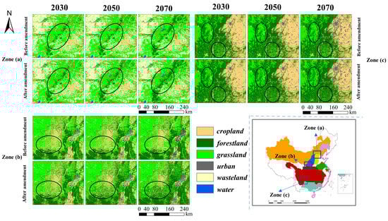 Comparison of land use in 2030–2070 before and after potential afforestation amendments. Zone (a), Zone (b), and Zone (c) show the before-and-after observation area for potential afforestation amendments to land use data.