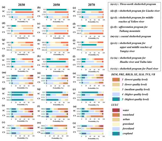 For carbon sequestration, the optimal configurations remain temporally stable in certain afforestation zones. For example, in the Three-north shelterbelt program, the dominant factors consistently include LULC (LULC = forestland) and vegetation resilience (VR = 3). Their associated Bayesian posterior probabilities increase by 2.2% and decrease by 1.6%, respectively. In the shelterbelt program for the Liaohe River, the optimal configuration comprises forest land and low DEM (DEM = 1), with corresponding increases of 2.4% and 0.3%. Results for the other zones are similarly presented in Figure 9. Within these planning efforts, the dominant ecological driving factors and their optimal threshold values vary across both spatial and temporal dimensions. Identifying these patterns is essential for maximizing the ecological benefits of potential afforestation amendments.