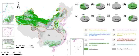 For soil conservation, the proportion of optimized areas varies considerably among the shelterbelt program zones. The Shelterbelt program for the middle reaches of the Yellow River and the shelterbelt program for the Huaihe River and Taihu Lake exhibit the lowest shares of optimized areas, at 1.1% and 0.1%, respectively. In contrast, the afforestation program for Taihang Mountain shows the highest optimization ratio, reaching 99.2%. Spatially, the optimized areas are largely consistent with the planned afforestation zones identified in this study. Additionally, regions characterized by relatively intact ecological conditions—such as the eastern portion of the Three-north shelterbelt program, the northern section of the shelterbelt program for upper and middle reaches of Yangtze River, and the southeastern part of the shelterbelt program for the Pearl River—are also classified as optimized zones for soil conservation (Figure 10).