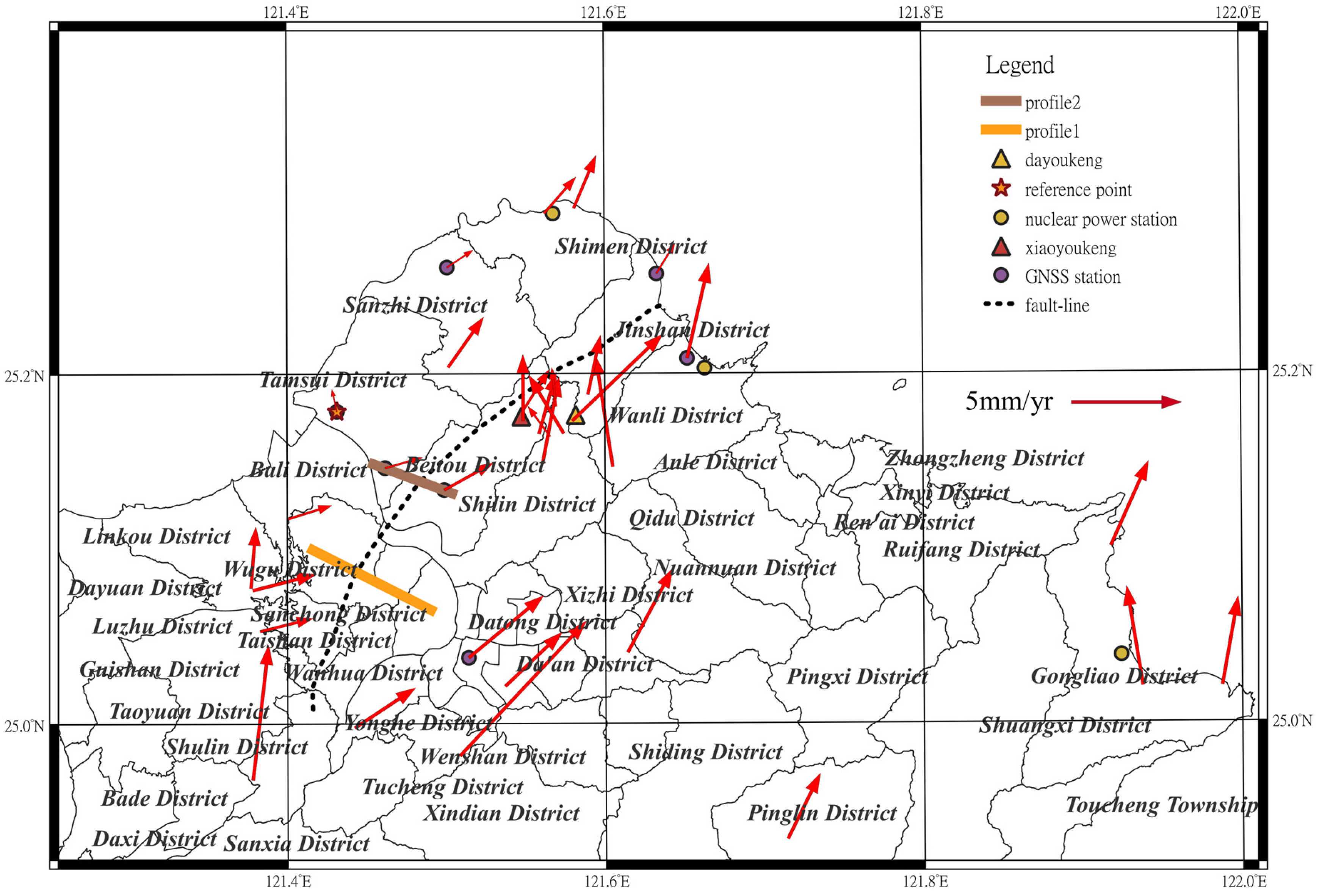 Figure 9 show that the coastal areas near nuclear power Stations 1 and 2 exhibit no notable interruptions or spatial gradients in either vertical or eastward velocities, in contrast to the sharp changes observed near the southern segment of the Shanchiao Fault. Near nuclear power Station 4, no valid PSInSAR result is available due to insufficient persistent scatterers or failure to meet the vertical consistency condition (Equation (9)). Similarly, no decomposed InSAR velocities are available at the fumaroles of Dayoukeng and Xiaoyoukeng, likely due to dense vegetation, rugged terrain, and the inability to meet the screening criteria for reliable decomposition. Future improvements in PS selection or decomposition methods may enable valid estimates at these geologically critical sites.