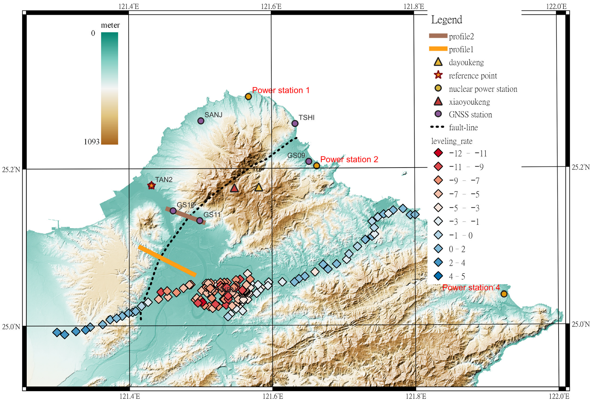 To further integrate lithologic information with the deformation signals, we extracted an additional profile across the Shanchiao Fault between Beitou and Shilin, crossing GNSS stations GS10 and GS11 (