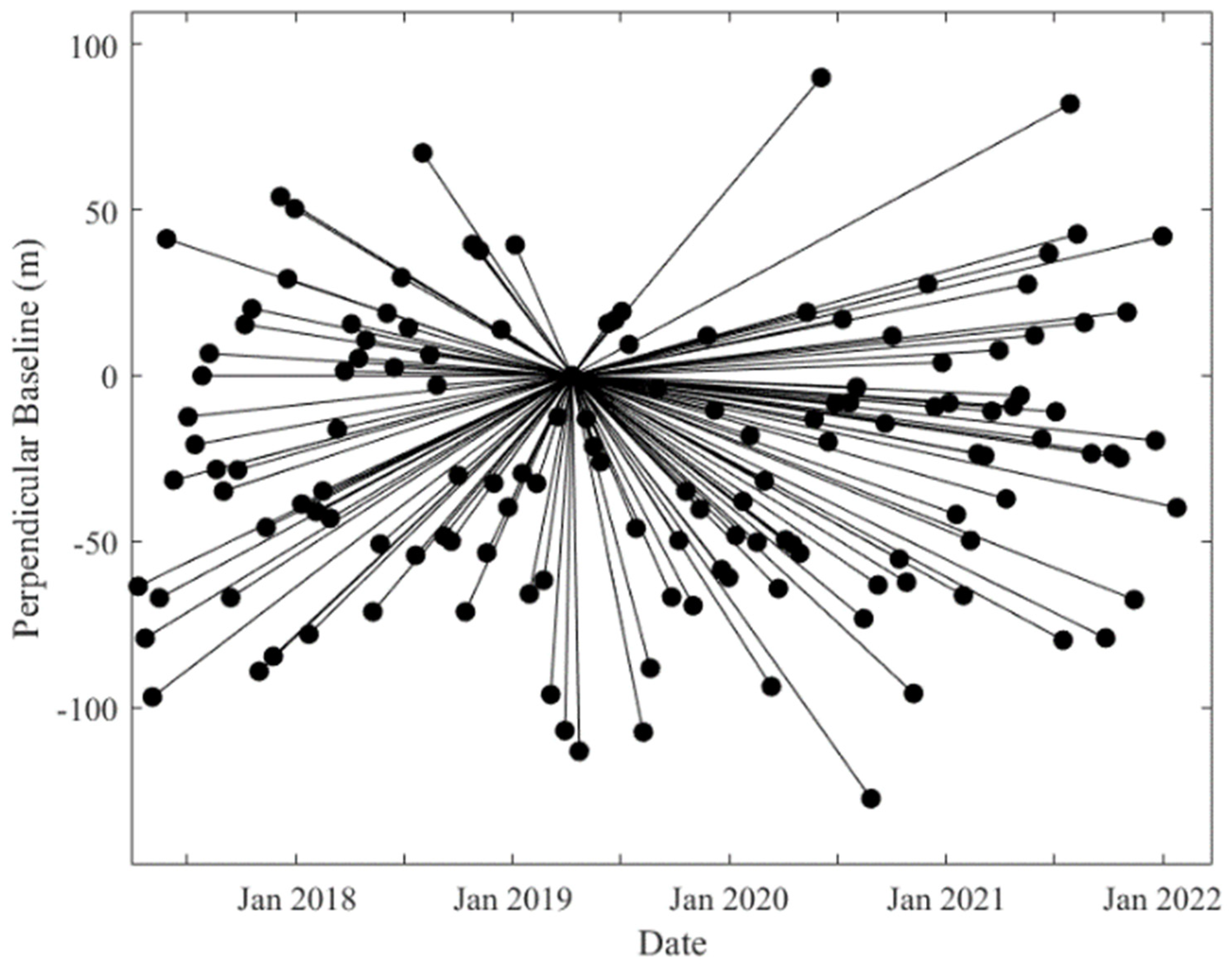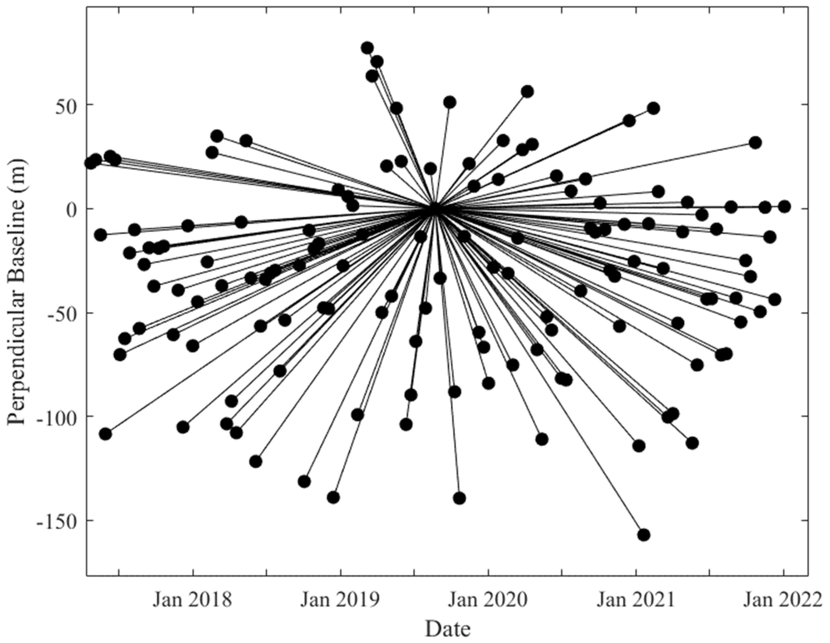 Figure 5 show the spatial–temporal baselines of the SAR image pairs for the ascending and descending tracks. In both datasets, perpendicular baselines were constrained within ±150 m. Negative perpendicular baselines indicate acquisition positions located south of the master image.
