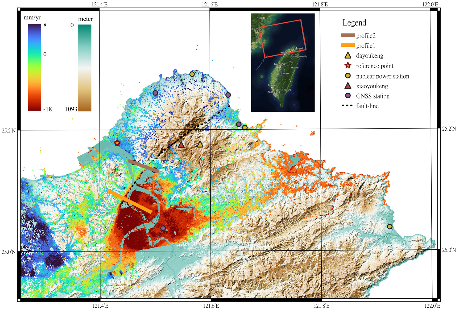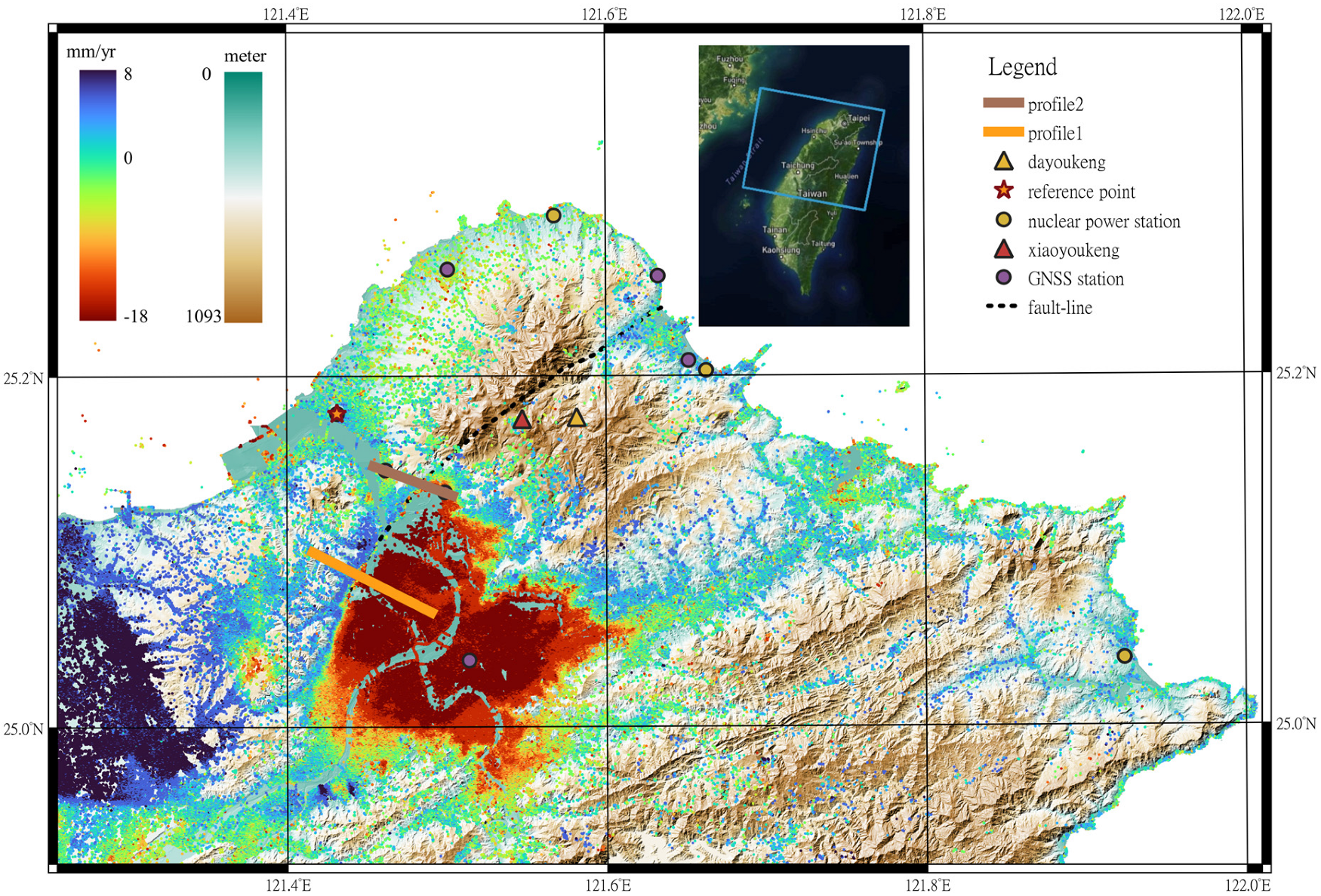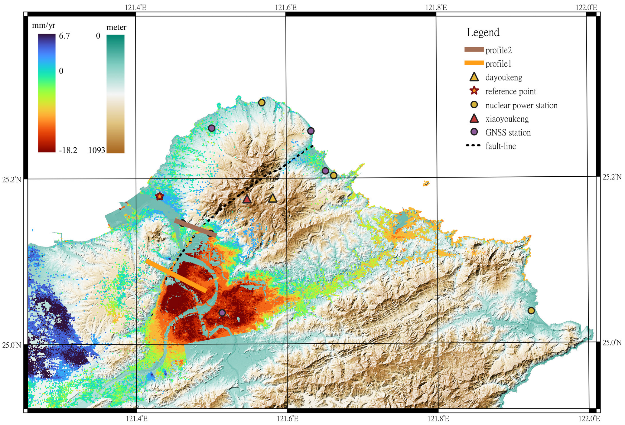 10]. The following three sections present targeted analyses derived from the PSInSAR results, focusing on land subsidence in the Taipei Basin, fault-related deformation across the Shanchiao Fault, and uplift patterns in northeastern Taoyuan and Linkou.