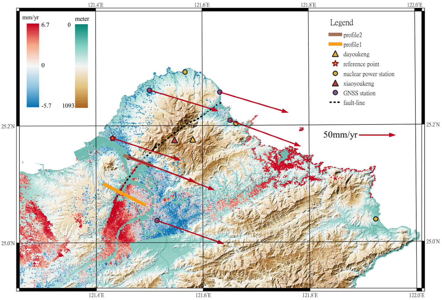 In summary, the combined evidence from PSInSAR velocity maps and fault-crossing profiles highlights a strong kinematic contrast across the southern Shanchiao Fault. However, the deformation characteristics deviate from those expected of a classic normal fault with surface rupture. Instead, they point to a complex interplay of tectonic stretching, sediment compaction, and anthropogenic subsidence in shaping the present-day surface deformation of the Taipei Basin.