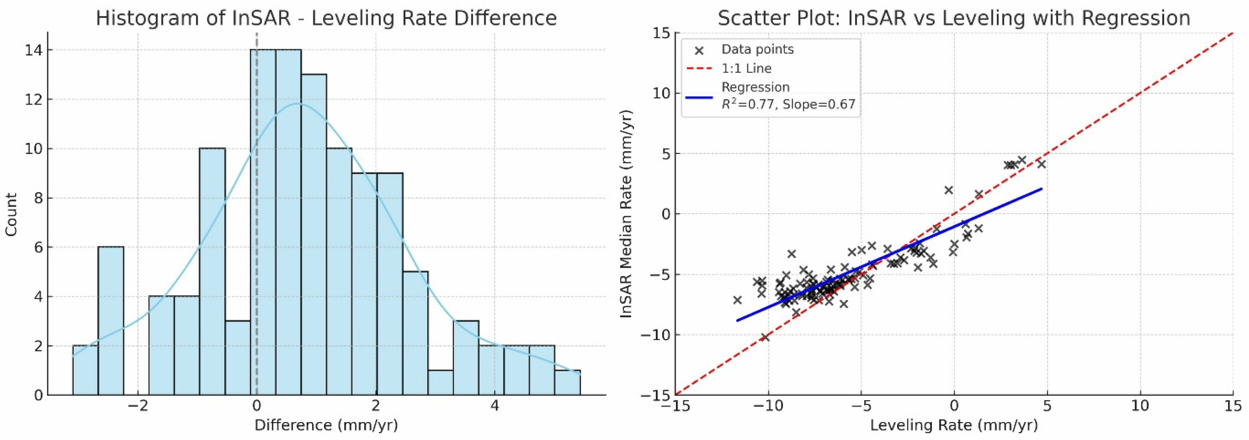 Figure 10 illustrates the comparison between InSAR-derived and leveling-derived vertical velocities. The left panel shows a histogram of the differences (InSAR minus Leveling). The distribution is centered slightly to the right of zero and shows a positive skew, indicating that InSAR generally yields more positive vertical rates than leveling. This implies that InSAR tends to underestimate subsidence or overestimate uplift relative to leveling benchmarks. The differences range from −3.09 mm/yr to 5.43 mm/yr, with a mean difference of 0.79 mm/yr and a root mean squared difference of 1.27 mm/yr, suggesting a mild but systematic bias.