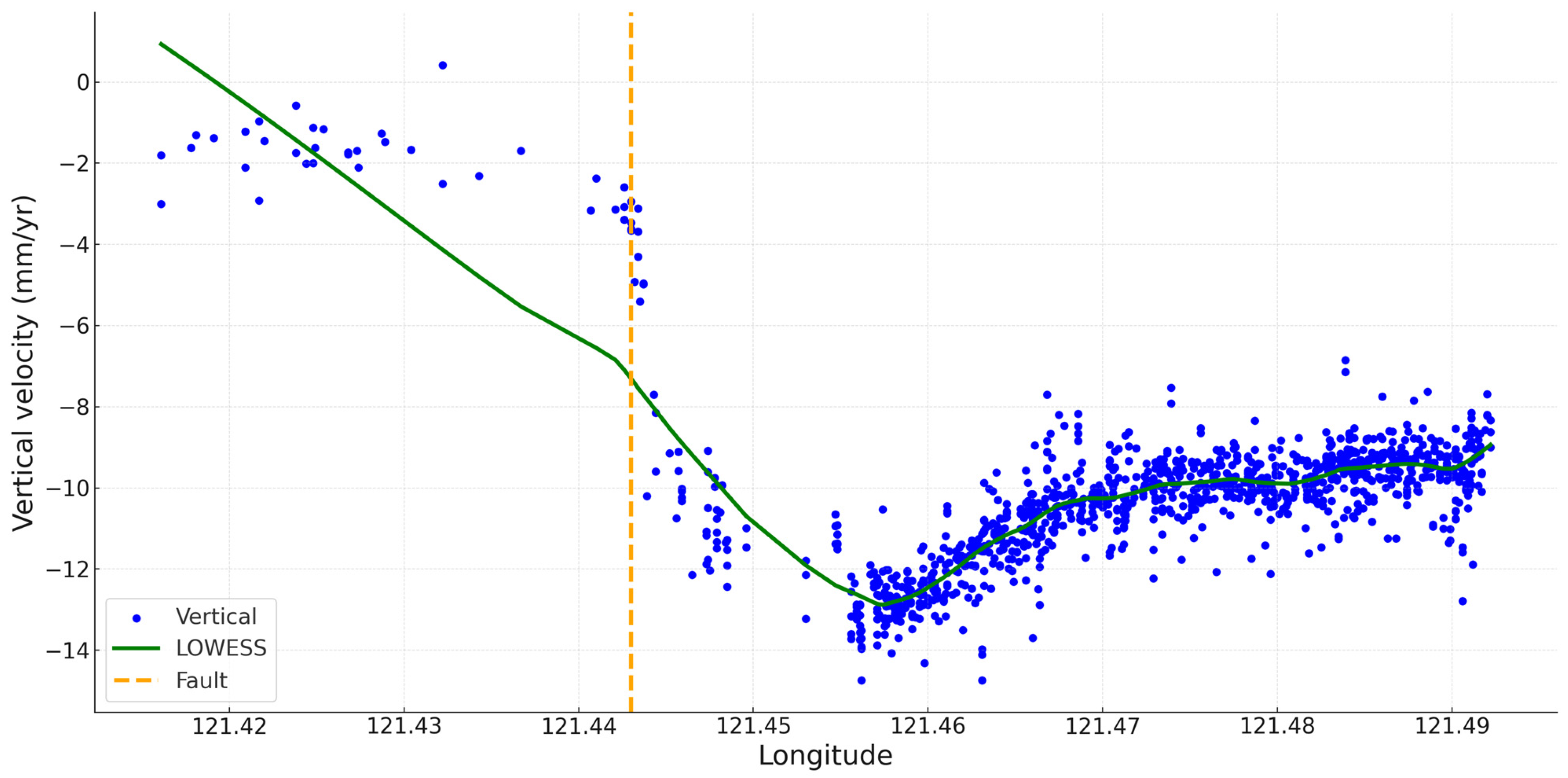Figure 11, the vertical velocity profile shows a sharp contrast at the fault: the footwall to the west exhibits weak or near-zero subsidence, whereas the hanging wall to the east shows markedly higher subsidence rates, commonly exceeding −10 mm/yr, with peak values approaching −14 mm/yr. This deformation gradient suggests a combination of tectonic extension and non-tectonic influences such as groundwater withdrawal and sediment compaction in the Taipei Basin. These observations are consistent with leveling and hydrological studies [