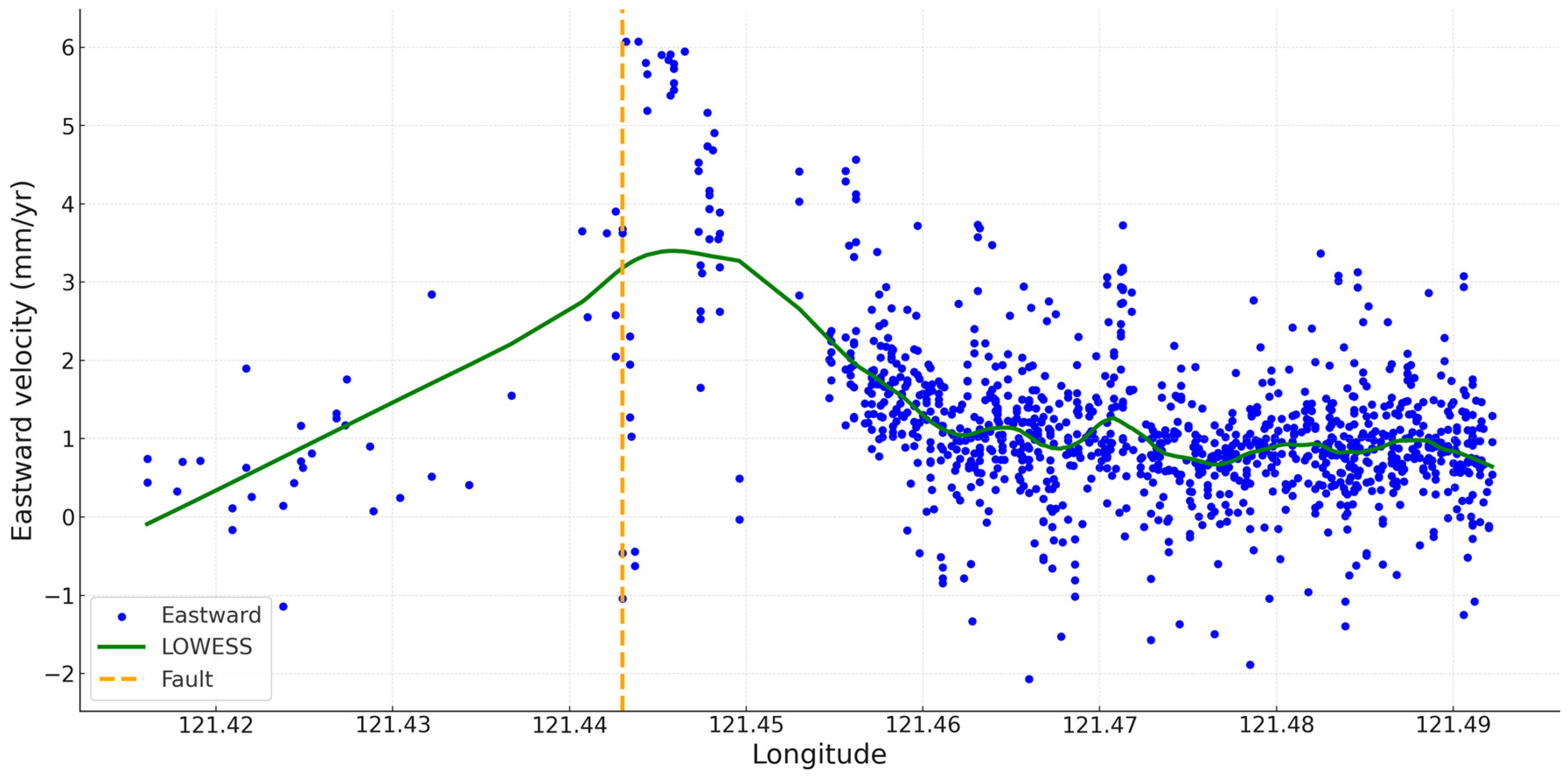 Together, the vertical and horizontal velocity profiles do not support the presence of discrete, surface-breaching slips along the southern segment of the Shanchiao Fault. Instead, they point to a broad deformation zone where strain is distributed over several kilometers. This is consistent with prior geophysical interpretations that the southern Shanchiao Fault is either inactive near the surface or deforms in a ductile or segmented manner [