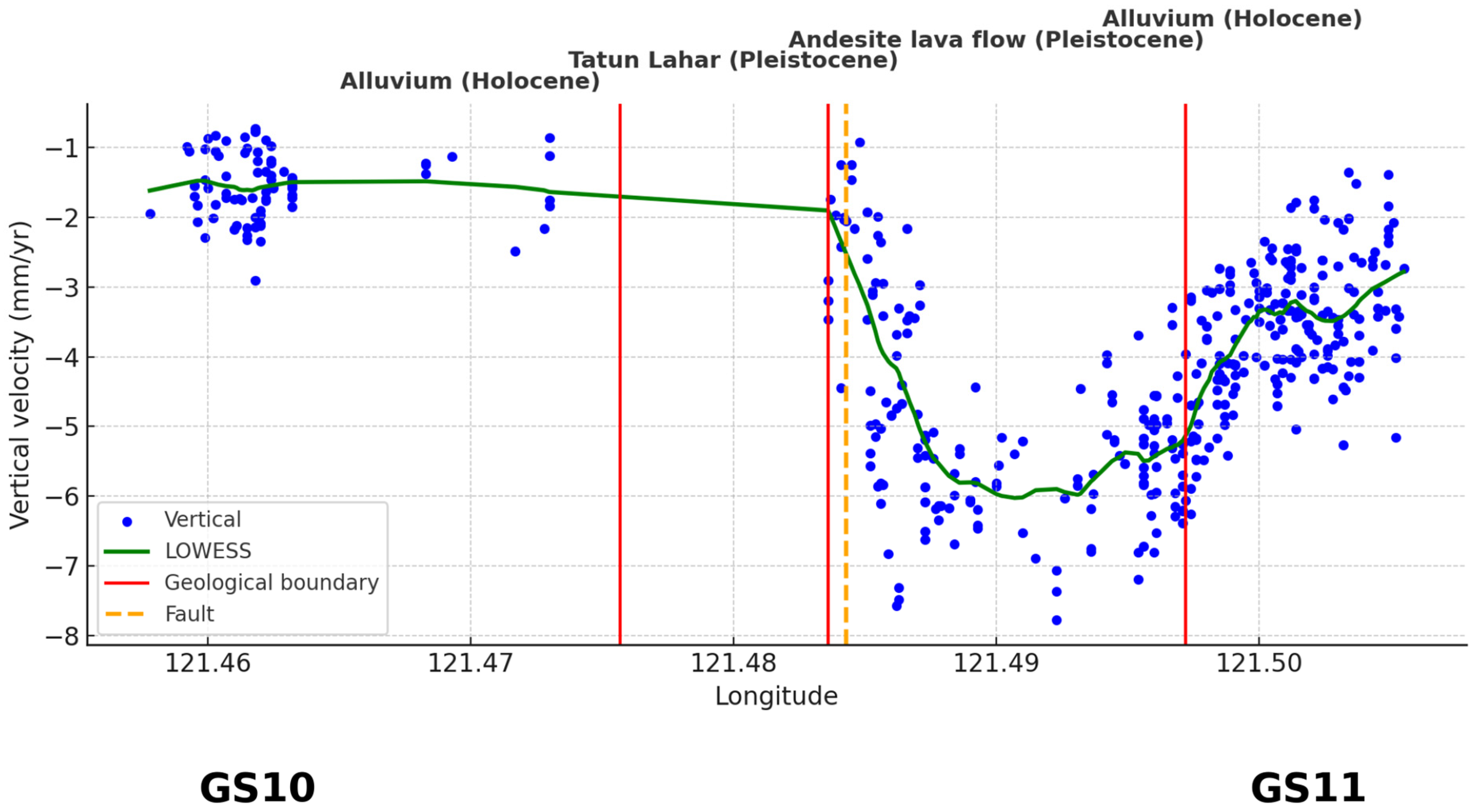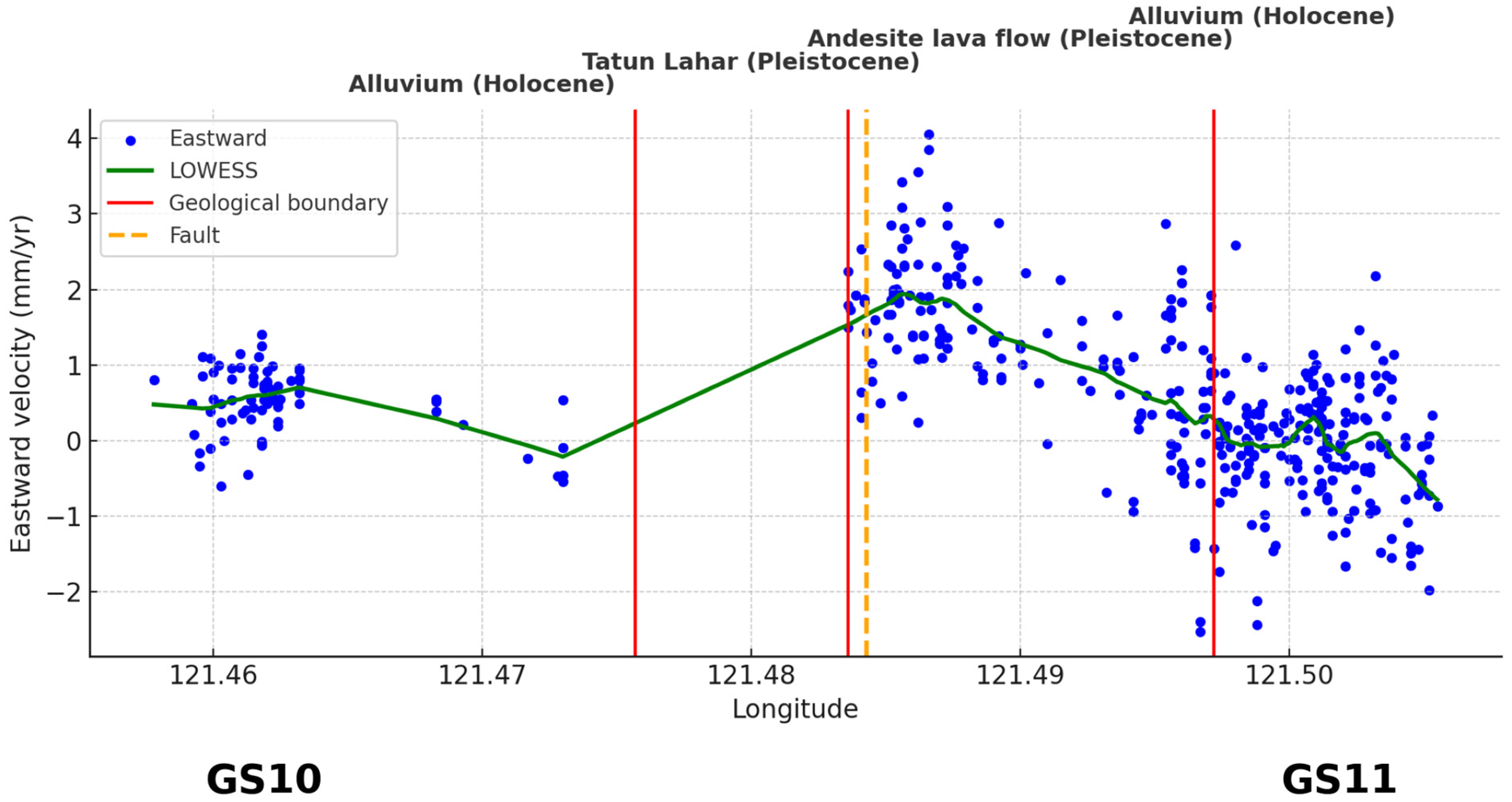 Figure 14) velocity profiles clearly show distinct deformation patterns across different lithologies: Alluvium (Holocene), Tatun Volcano Group—Lahar (Pleistocene), Tatun Volcano Group—Andesite lava flow (Pleistocene), and Alluvium (Holocene). The Shanchiao Fault coincides with the boundary between the Lahar and Andesite units at ~121.484°E, indicating that the deformation discontinuity is lithologically controlled. The vertical velocities reveal a sharp subsidence gradient, while the eastward velocities highlight systematic lateral offsets, both of which are enhanced by lithologic contrasts. Together, these results suggest that the distributed strain across the Shanchiao Fault reflects a combined effect of faulting, lithologic mechanical contrasts, and possible hydrogeological differences.