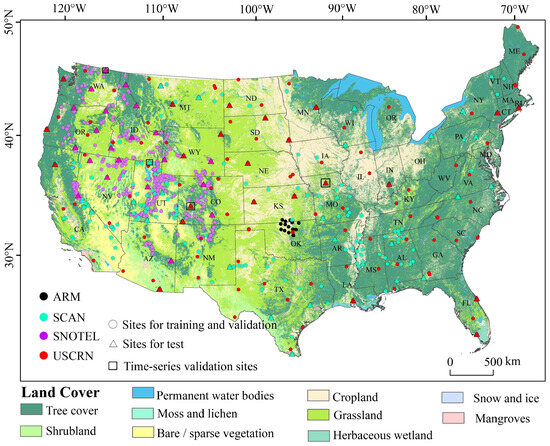 This study used in situ SSM datasets from the International Soil Moisture Network (ISMN), comprising four observation networks: ARM, SNOTEL, SCAN, and USCRN [23,24,25,26]. A total of 675 sites were included (Figure 1), each providing SSM at depths of 5, 10, 20, 50, and 100 cm. Because C-band penetration rarely exceeds 5 cm, only the 5 cm records were extracted for the period from 2019 to 2023. Data quality was ensured using ISMN calibration flags. Subsequent plausibility filtering was then applied: (1) A global SSM saturation threshold of 0.6 m3/m3 [27] was applied, and all values outside the physically valid range of 0–0.6 m3/m3 were discarded; (2) to minimize the impact of frozen conditions on soil moisture retrieval, only records with a soil temperature > 0 °C at the 5 cm depth were retained (soil temperature is extracted from the 5 cm site during the same period). Measurements on the same date were averaged to produce daily near-surface soil moisture values. Site measurements were then matched to the 500 m MODIS grid, where multiple sites fell within one grid cell, an unweighted arithmetic mean was calculated to obtain a representative in situ SSM [7]. Finally, only those daily averages coincident with Sentinel-1 acquisition times were retained.