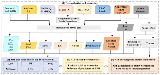 The rest of this paper is organized as follows. Section 2 describes the study area and datasets used for SSM retrieval. Section 3 introduces the ADF model and SHAP algorithm used for SSM retrieval in detail. Section 4 evaluates and analyzes the ADF model and machine learning methods and interpretable analysis of ADF combined with SHAP algorithm. Section 5 discusses other advantages of the ADF model. Section 6 concludes this study.
