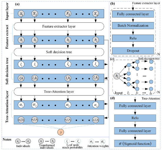 (a) Network structure of the ADF model, (b) unit structure of the feature extractor layer, (c) Unit structure of the soft decision tree, and (d) tree-attention layer.