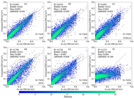 Figure 4 presents the results after sample-based validation. ADF model demonstrated the highest overall accuracy among all models, with an R2 of 0.868 and ubRMSE of 0.041 m3/m3. The two ensemble learning methods, RF and XGBoost, achieved the next highest accuracy, both yielding R2 of 0.803–0.810 and ubRMSE of 0.050–0.051 m3/m3. The DNN performed slightly worse than the ensemble methods, with R2 of 0.790 and ubRMSE of 0.053 m3/m3. In contrast to previous findings, KNN exhibited lower accuracy than both DNN and the ensemble methods, achieving an R2 of 0.720 and ubRMSE of 0.060 m3/m3. SVR showed the poorest performance, with an R2 of 0.233 and ubRMSE of 0.100 m3/m3.
