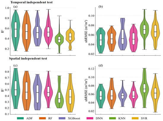 Figure 6c,d present spatial independent test medians. ADF again performed best, with median R2 of 0.500 and median ubRMSE of 0.052 m3/m3. DNN accuracy trailed the ADF, with median R2 of 0.460 and median ubRMSE of 0.054 m3/m3. RF and XGBoost followed with median R2 of 0.450–0.452 and median ubRMSE of 0.052–0.054 m3/m3. KNN and SVR yielded the worst medians, with R2 of 0.360–0.400 and ubRMSE of 0.060–0.070 m3/m3.