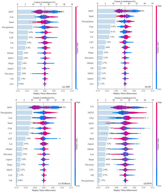 Figure 7 presents the SHAP interpretation results for the ADF model, tree-based models (RF, XGBoost), and the deep learning model (DNN). Due to the poor accuracy and generalization capability of KNN and SVR models in SSM retrieval task, their interpretability analyses were excluded.