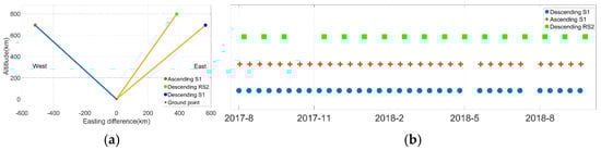 (a) Spatial configuration of multi-source SAR data acquisition; (b) temporal distribution of multi-source SAR data acquisition dates.